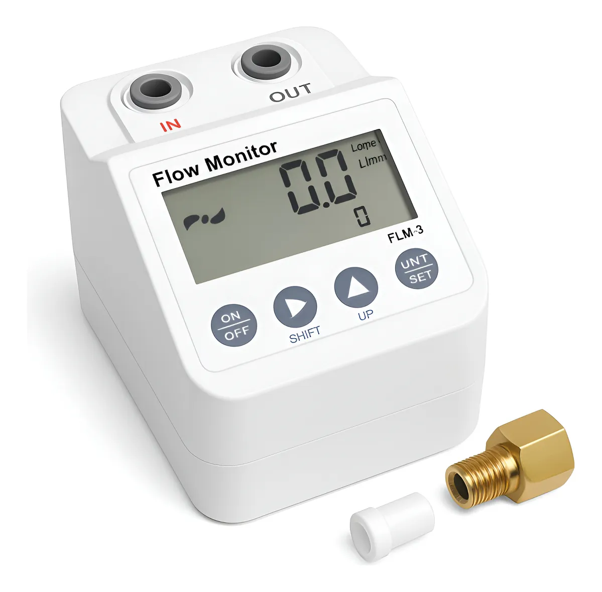 El HM Digital FLM-3 es un medidor de flujo de agua diseñado para monitorear con precisión el caudal en sistemas de filtración, RO o DI. Su pantalla LCD permite visualizar rápidamente el flujo y configurar alarmas cuando se superan los límites establecidos.