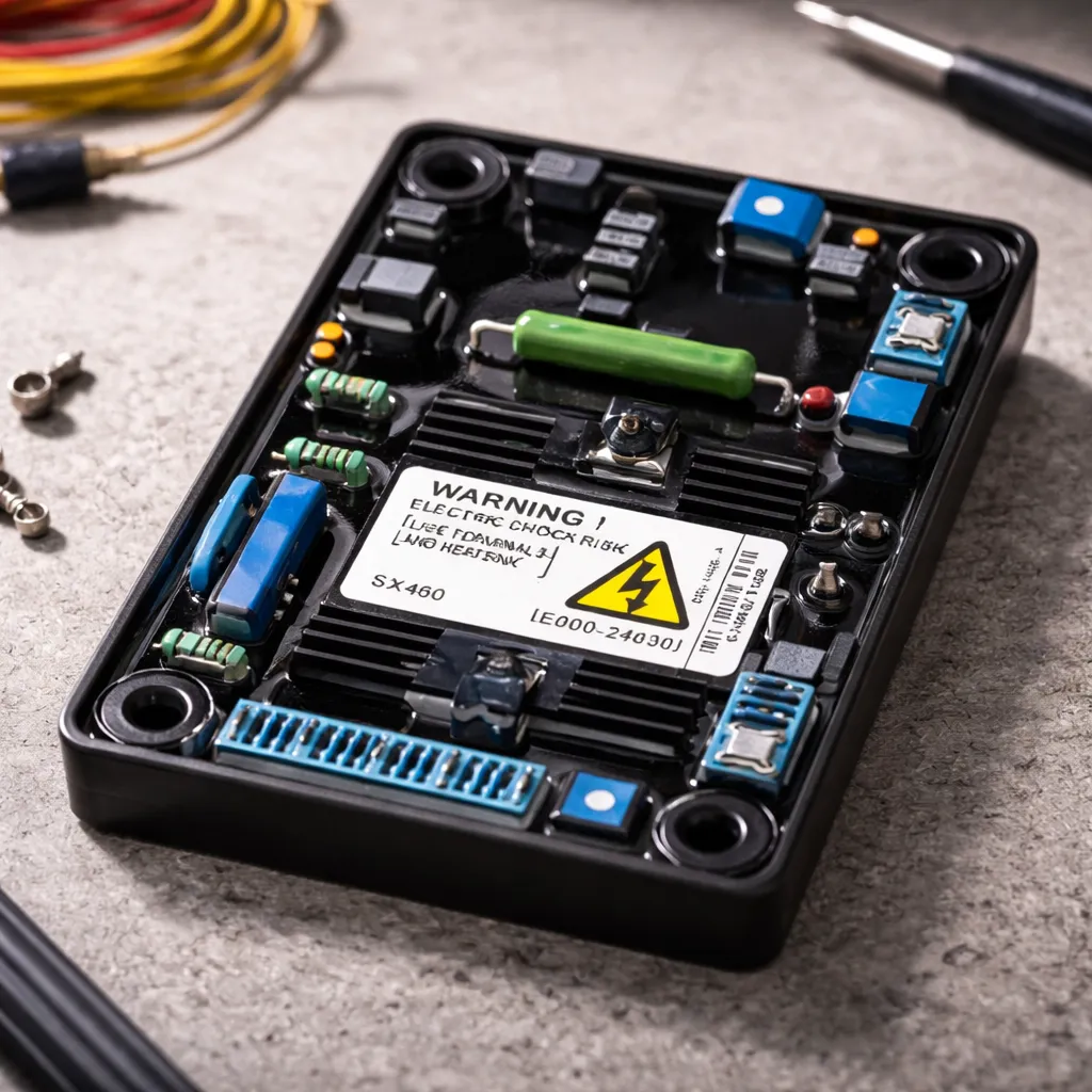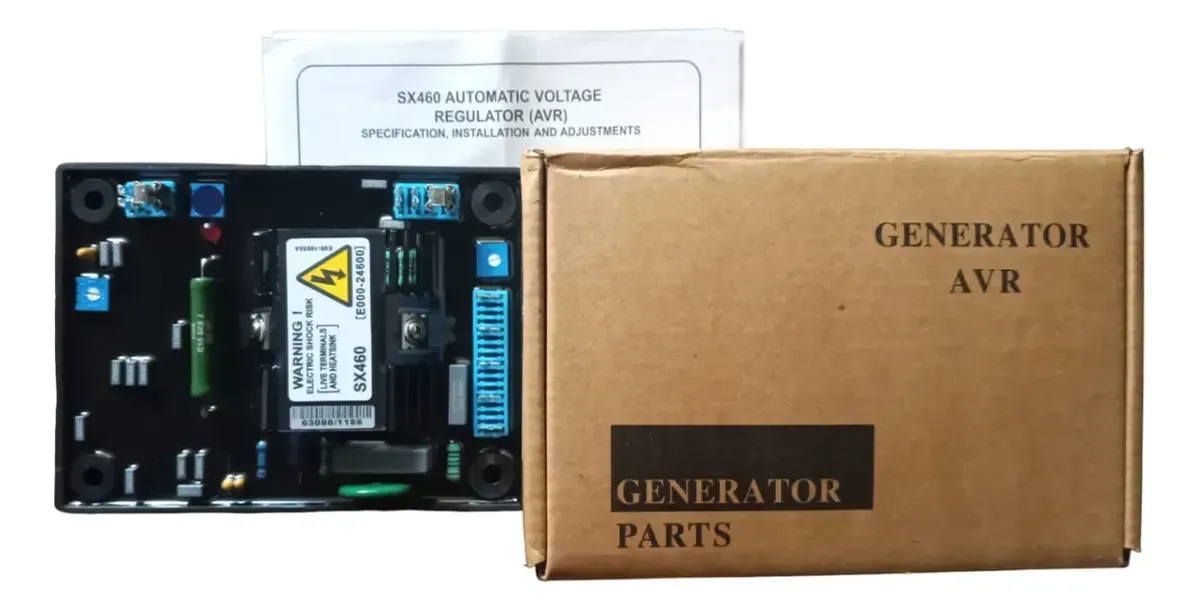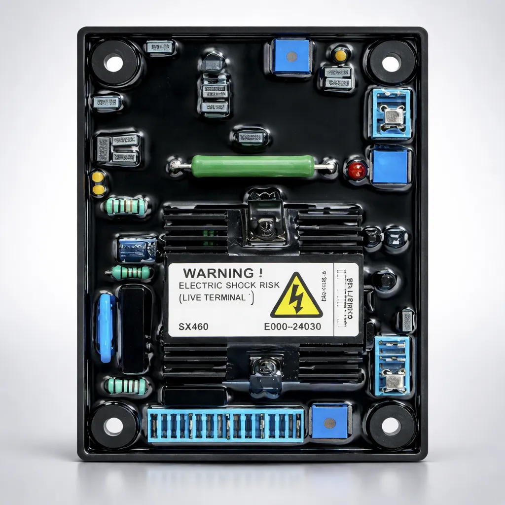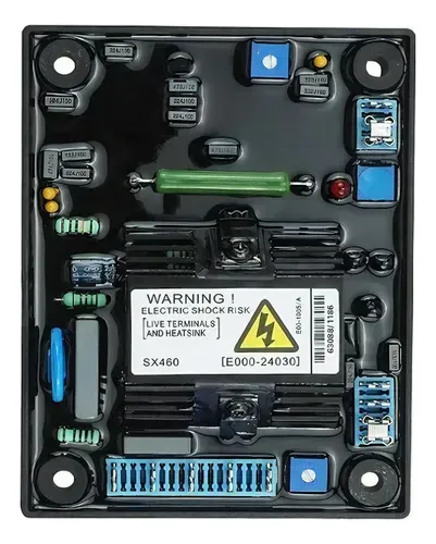 El SX460 es un regulador automático de voltaje (AVR) diseñado para controlar la excitación de generadores eléctricos sin escobillas, garantizando una salida de voltaje estable incluso frente a variaciones de carga. Este regulador utiliza un sistema electrónico de control basado en detección de voltaje y comparación con referencia interna para ajustar automáticamente la corriente de excitación del alternador. Incorpora protección por baja frecuencia (UFRO), circuitos de estabilidad y control de excitación, lo que lo convierte en una solución confiable para grupos electrógenos industriales y comerciales.