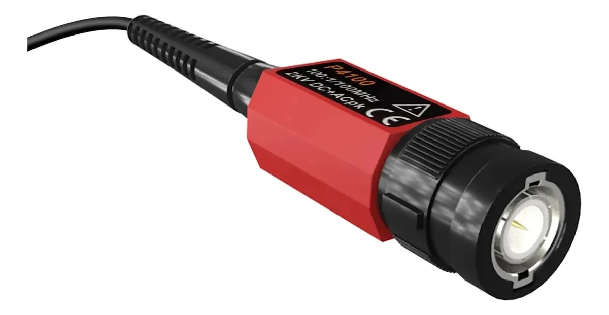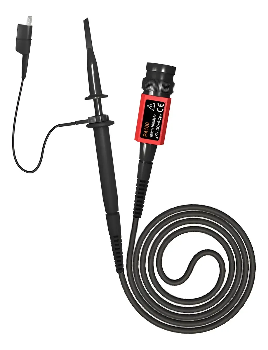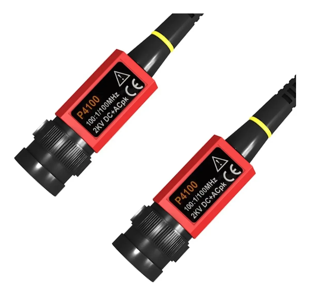 Ficha técnica: Modelo: P4100 Ancho de banda: 100 MHz Atenuación: x100 Impedancia de entrada: 100 Megaomhios Capacitancia de entrada: aproximadamente 4 pF Rango de tensión máxima: 600 V DC o AC pico Conector: BNC estándar Longitud del cable: aproximadamente 1.2 metros Material del cuerpo: plástico reforzado y cable coaxial de alta calidad