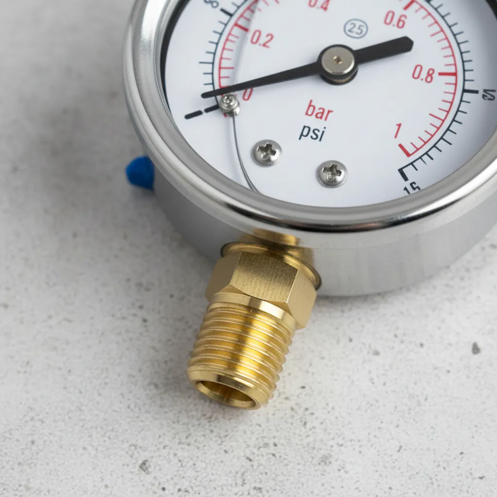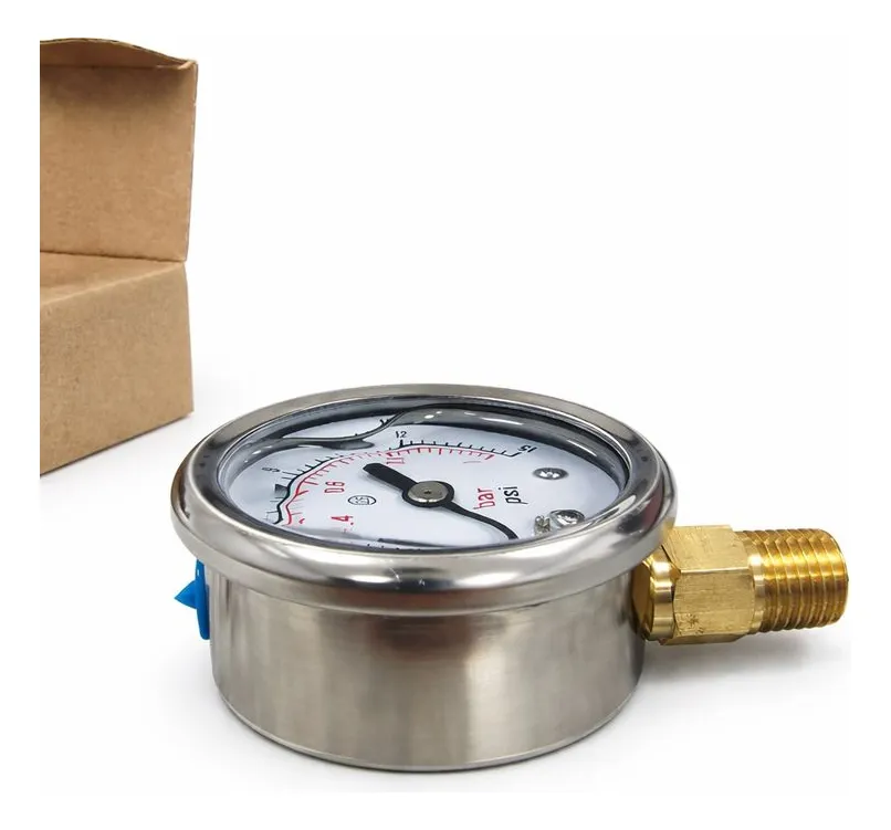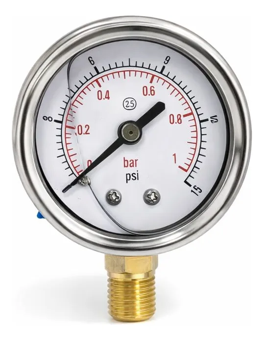 Modo de uso Verificar que el sistema en el que se instalará el manómetro esté libre de presión antes de conectarlo. Seleccionar el punto de medición adecuado con rosca NPT 1/4 compatible con el equipo o tubería. Aplicar sellador o cinta de PTFE en la rosca para asegurar una unión hermética. Enroscar firmemente el manómetro en la conexión, sin forzar ni inclinar, hasta que quede bien ajustado. Una vez instalado, iniciar el sistema gradualmente hasta alcanzar presión dentro del rango de 0 a 1 bar. Observar la lectura del puntero en la escala para determinar la presión actual del sistema. Si la aguja vibra o se mueve de forma inestable, la cámara con glicerina ayudará a amortiguar pulsaciones; aun así, evitar golpes mecánicos. Para mediciones continuas, verificar periódicamente el estado del manómetro y reemplazarlo si se detectan daños o pérdida de fluido. Antes de desmontar, liberar la presión del sistema completamente para evitar accidentes.