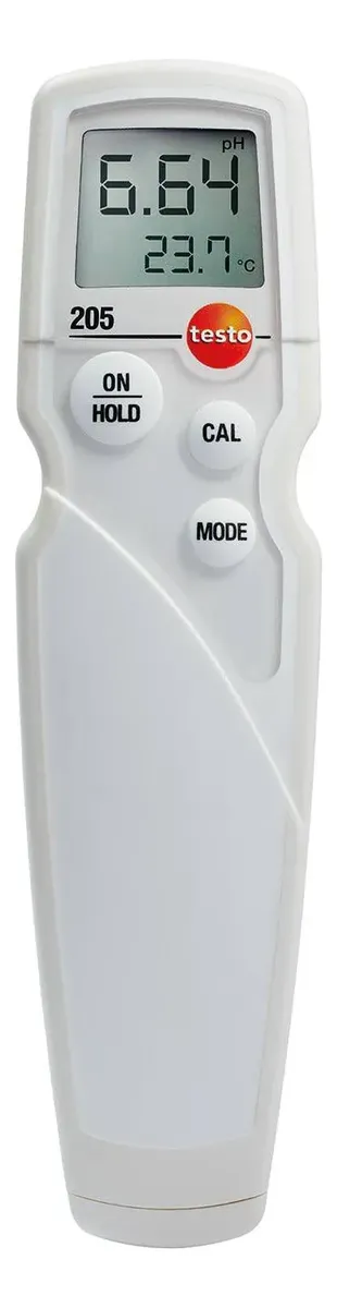 Ficha técnica Marca: Testo Modelo: 205 Código de producto: 0563 2051 Tipo de instrumento: Medidor portátil de pH y temperatura Rango de medición pH: 0 a 14 pH Resolución pH: 0,01 pH Precisión pH: ±0,02 pH Rango de medición temperatura: 0 a +60 °C Temperatura de funcionamiento: 0 a +50 °C Resolución temperatura: 0,1 °C Precisión temperatura: ±0,4 °C Intervalo de medición: 2 mediciones por segundo Tipo de pantalla: LCD de 2 líneas Material de la carcasa: ABS Clase de protección: IP65 Dimensiones: 145 × 38 × 167 mm Peso: 135 g Alimentación: 4 pilas tipo botón LR44 Autonomía aproximada: 80 horas (con autoapagado a los 10 minutos) Temperatura de almacenamiento: -20 a +70 °C Conformidad: CE 2014/30/EU Especificaciones Instrumento portátil para medición de pH y temperatura en productos semisólidos. Sonda combinada de pH y temperatura reemplazable por el usuario. Electrolito en gel que no requiere mantenimiento. Pantalla retroiluminada con visualización simultánea de pH y temperatura. Compensación automática de temperatura. Función Auto-Hold con señal acústica al estabilizar la medición. Posibilidad de calibración en uno o dos puntos. Incluye tapa de almacenamiento con gel protector. Carcasa resistente apta para uso en entornos industriales y alimentarios.
