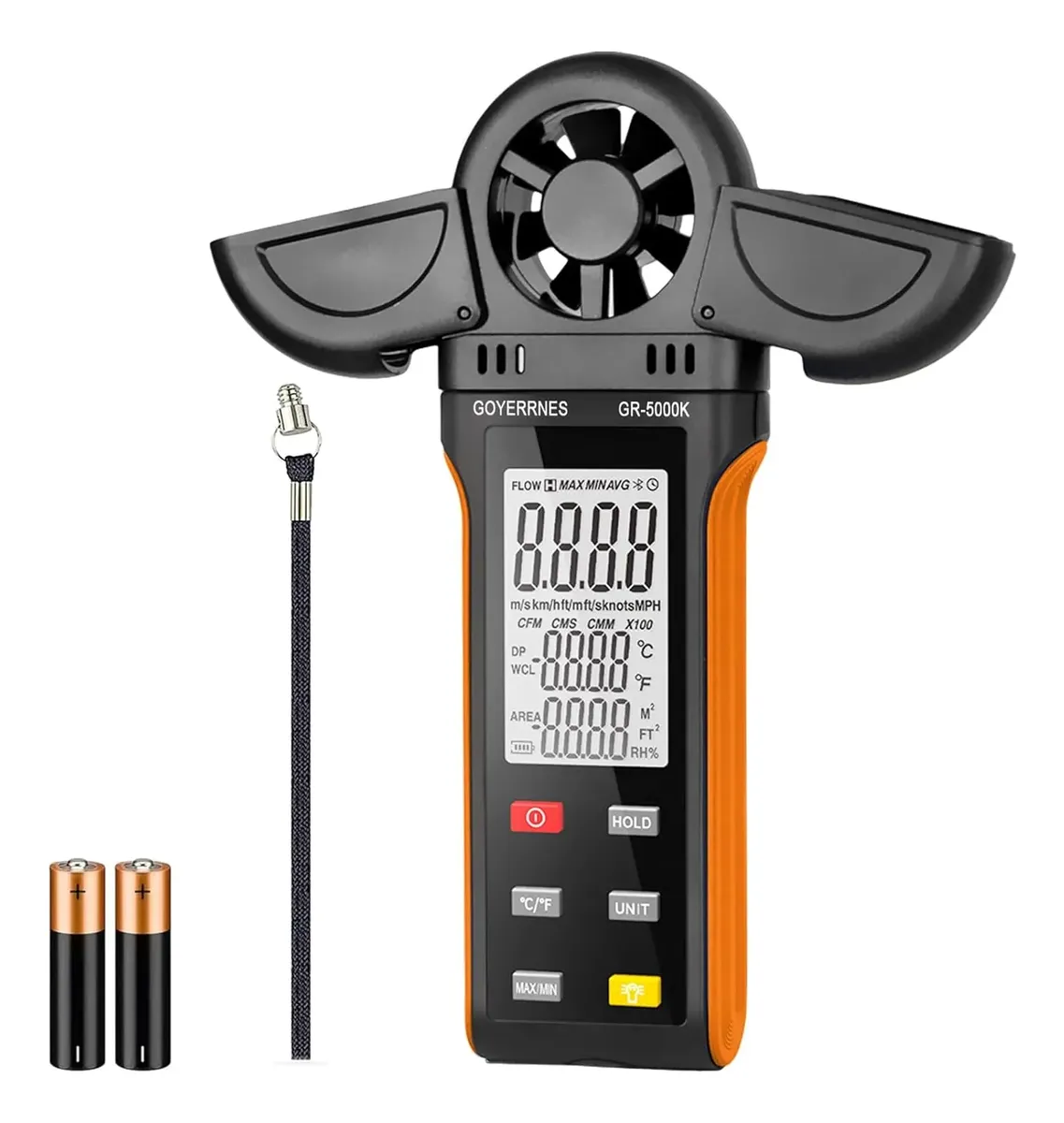 Anemómetro digital portátil diseñado para la medición precisa de la velocidad del viento, temperatura y humedad ambiental. Este equipo es ideal para aplicaciones en sistemas de ventilación y aire acondicionado, meteorología básica, actividades al aire libre, navegación, agricultura, deportes y control ambiental. Su diseño compacto y ergonómico permite un uso cómodo en campo, ofreciendo lecturas rápidas y confiables en distintos entornos.