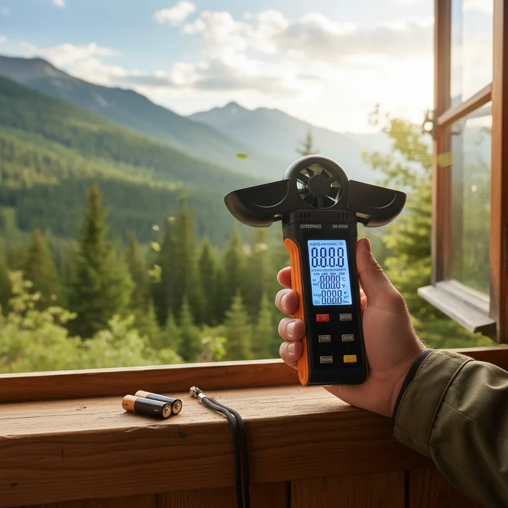 Colocar las baterías en el compartimiento correspondiente respetando la polaridad indicada. Encender el equipo utilizando el botón de encendido. Seleccionar la unidad de medición deseada para la velocidad del viento. Orientar el sensor hacia el flujo de aire a medir, manteniendo el equipo estable. Esperar a que las lecturas se estabilicen en la pantalla antes de registrar los valores. Una vez finalizada la medición, apagar el equipo para conservar la vida útil de las baterías. Guardar el anemómetro en su funda o estuche cuando no esté en uso.