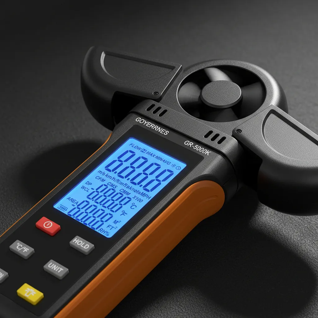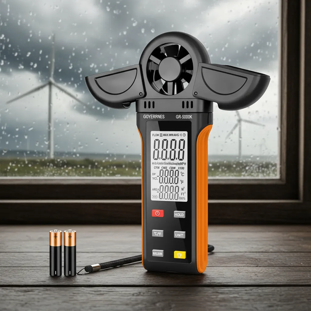 Tipo de instrumento: Anemómetro digital portátil Modelo: Anemómetro digital con sensor rotatorio Funciones de medición: Velocidad del viento, temperatura, humedad Rango de medición de viento: Amplio rango para mediciones ambientales y técnicas Unidades de velocidad: m/s, km/h, ft/min, mph, nudos Medición de temperatura: Sensor térmico integrado Medición de humedad: Sensor de humedad relativa integrado Pantalla: Display digital de fácil lectura Alimentación: Baterías Material del cuerpo: Plástico resistente Formato: Equipo portátil de mano Marca: GOYERRNES Modelo: Anemómetro digital portátil Tipo de instrumento: Anemómetro, termómetro e higrómetro Tipo de sensor de viento: Sensor rotatorio con hélice orientable Rango de medición de velocidad del viento: 0,3 a 30 m/s Precisión de velocidad del viento: ±5 % Unidades de medición de viento: m/s, km/h, mph, ft/min, nudos Rango de medición de temperatura: -10 °C a 45 °C Precisión de temperatura: ±1,5 °C Rango de medición de humedad: 20 % a 80 % HR Precisión de humedad: ±5 % HR Pantalla: LCD digital Funciones adicionales: Retención de datos, selección de unidades Alimentación: Baterías Material del cuerpo: Plástico de alta resistencia Color: Negro con detalles en naranja Uso: Portátil, de mano Aplicaciones: HVAC, ventilación, meteorología básica, actividades al aire libre Especificaciones Instrumento multifunción que permite medir velocidad del viento, temperatura y humedad en un solo equipo Sensor rotatorio orientable que facilita la captura del flujo de aire desde distintas direcciones Lectura digital clara y rápida Selección de unidades de medida según la aplicación Diseño liviano y compacto para transporte y uso en campo Adecuado para uso profesional y doméstico Incluye accesorios de transporte según presentación del kit