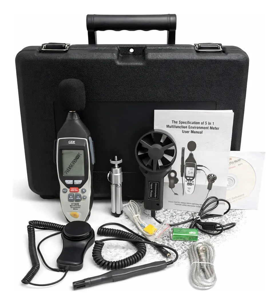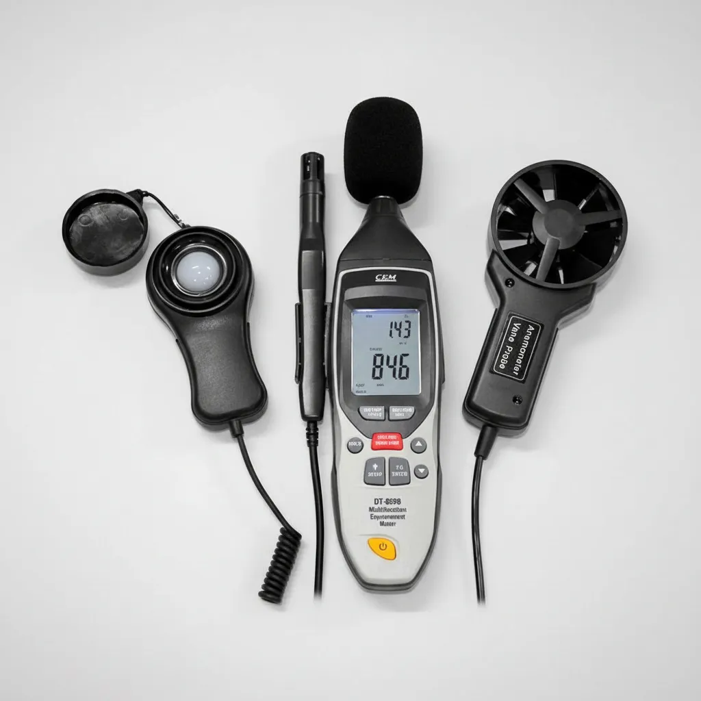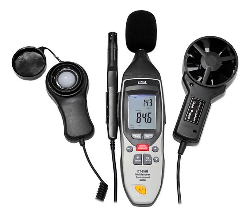 El medidor de ambientes multifunción profesional CEM DT-859B es un instrumento portátil diseñado para la medición de parámetros ambientales clave en interiores y exteriores. Permite evaluar condiciones de confort y calidad ambiental mediante la medición de temperatura, humedad relativa, velocidad de aire y otros parámetros combinados, siendo ideal para aplicaciones en HVAC, mantenimiento edilicio, control ambiental, auditorías técnicas y uso profesional en campo.