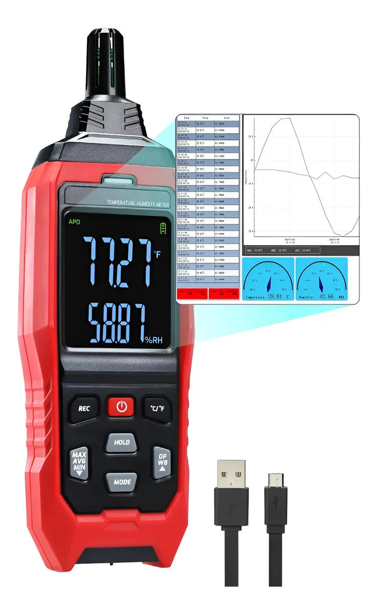 El medidor multifuncional de temperatura y humedad es un instrumento diseñado para medir simultáneamente la temperatura ambiente y la humedad relativa. Permite monitorear las condiciones ambientales en distintos entornos, siendo adecuado para uso en hogares, oficinas, almacenes, invernaderos y espacios donde se requiere control climático. Ofrece un amplio rango de medición y lectura digital clara para un seguimiento preciso de los valores ambientales.