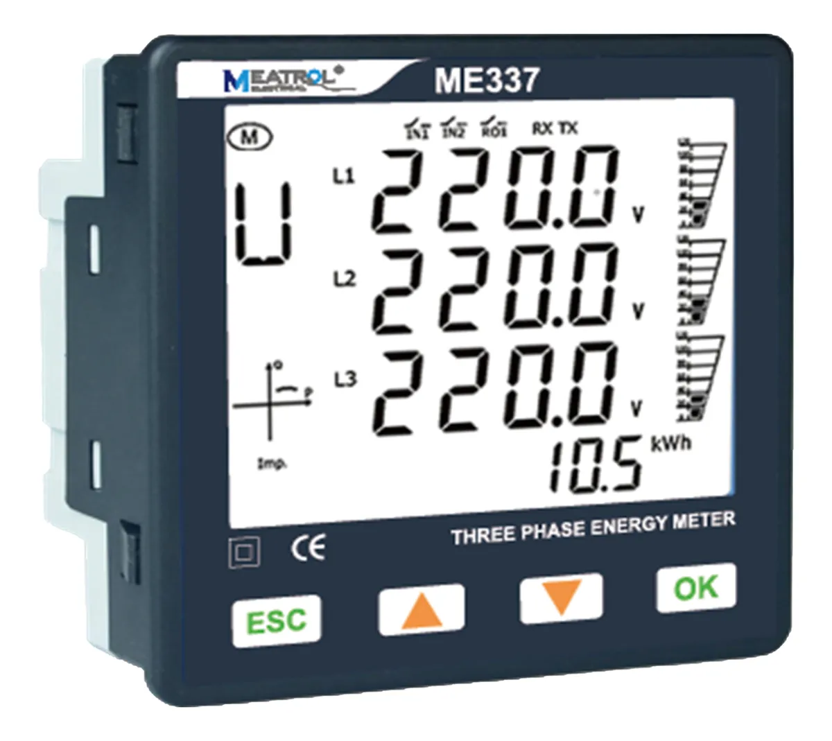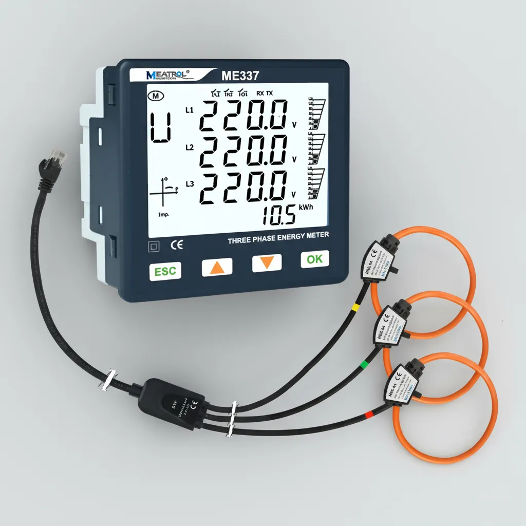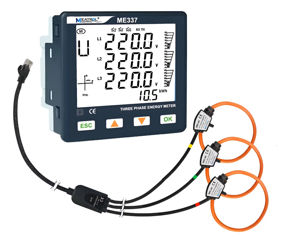 El analizador de energía eléctrica ME337ND2 con tres bobinas Rogowski CRM-36 de 36 mm y rango de 600 A es un equipo de medición avanzado diseñado para monitorear y registrar parámetros eléctricos en sistemas monofásicos y trifásicos. Ideal para auditorías energéticas, control de consumo, mantenimiento preventivo y diagnóstico de calidad de energía, combina precisión, facilidad de instalación y comunicación digital mediante protocolo Modbus RTU.