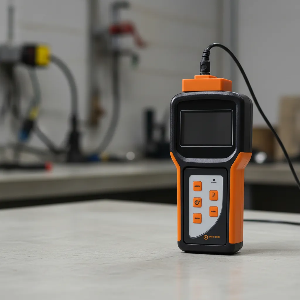 Limpiar y secar la superficie externa del tanque en el punto donde se realizará la medición. Apoyar la sonda ultrasónica firmemente sobre la pared del tanque. Observar la lectura en la pantalla: el equipo indicará si hay o no presencia de líquido en ese nivel. Para determinar el nivel exacto, desplazar la sonda verticalmente hasta identificar el punto más alto donde aún detecta líquido. Repetir el proceso en distintos sectores del tanque si se requiere mayor precisión. Apagar el equipo después de usar y guardar en su estuche de protección.