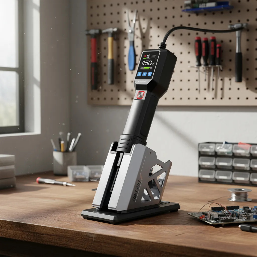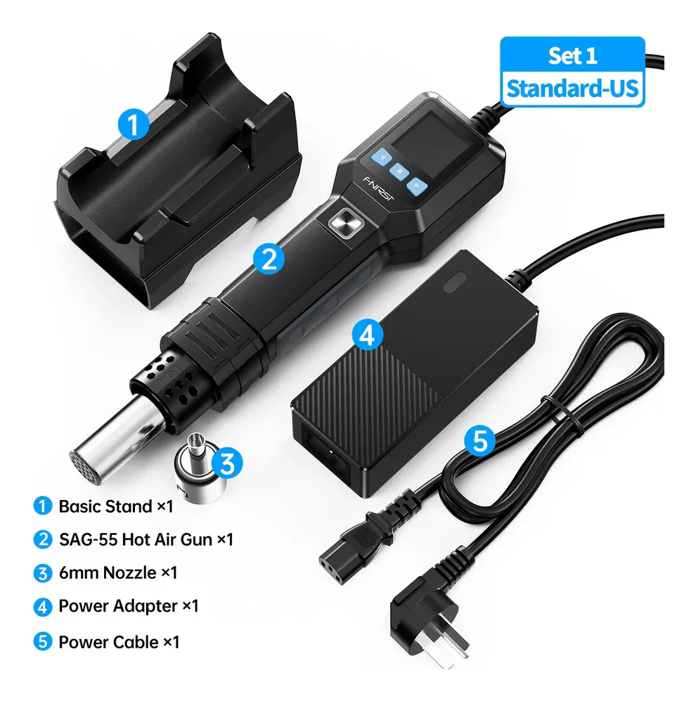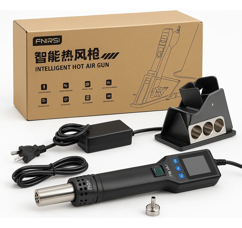 La pistola de aire caliente inteligente FNIRSI SAG-55 es una estación de calor portátil diseñada para tareas de soldadura, desoldado y reparación electrónica con alta precisión. Incorpora un sistema de control PID para mantener una temperatura estable, ventilador sin escobillas de larga vida útil y funciones automáticas que facilitan el uso profesional. Su diseño ergonómico, la pantalla LCD integrada y los modos de operación inteligentes permiten trabajar con mayor seguridad, rapidez y comodidad.