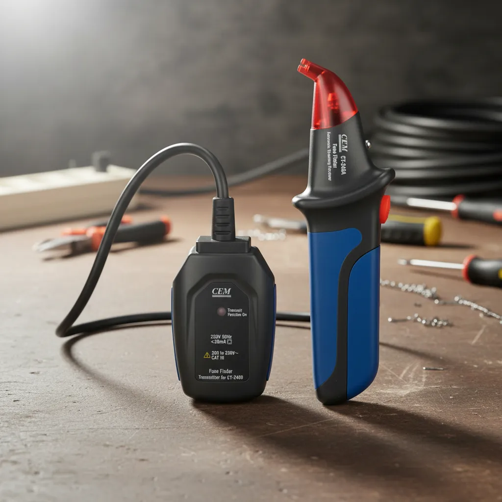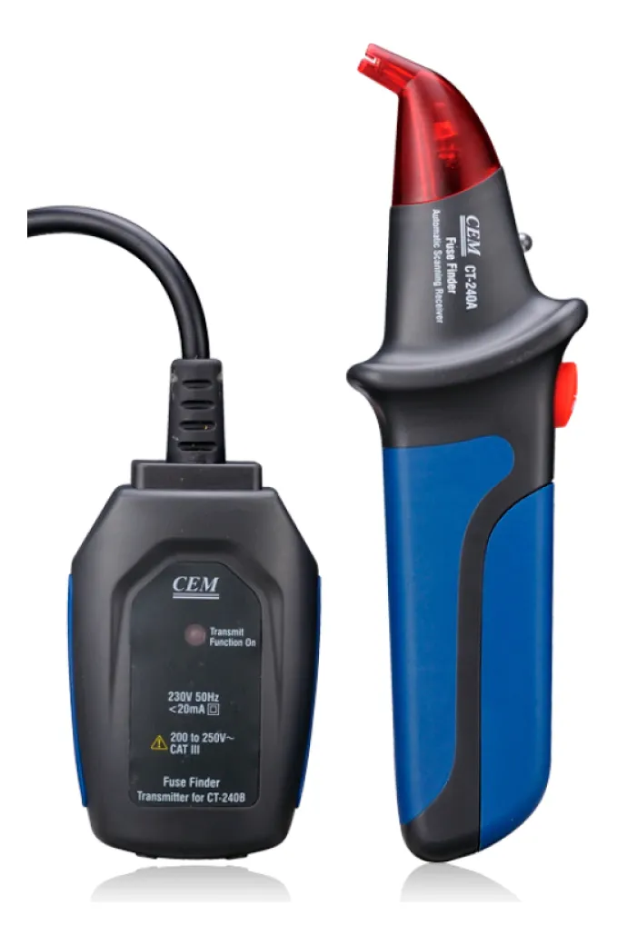 El localizador/rastreador de cables CEM CT-240 (CT240) es un identificador digital de circuitos diseñado para encontrar de forma rápida la llave térmica o fusible correspondiente a un tomacorriente o circuito energizado. Es ideal para electricistas, mantenimiento e instalaciones, ya que permite rastrear circuitos sin necesidad de cortar la energía, mediante indicación visual (LED) y sonora para ubicar con precisión el interruptor correcto en el tablero.