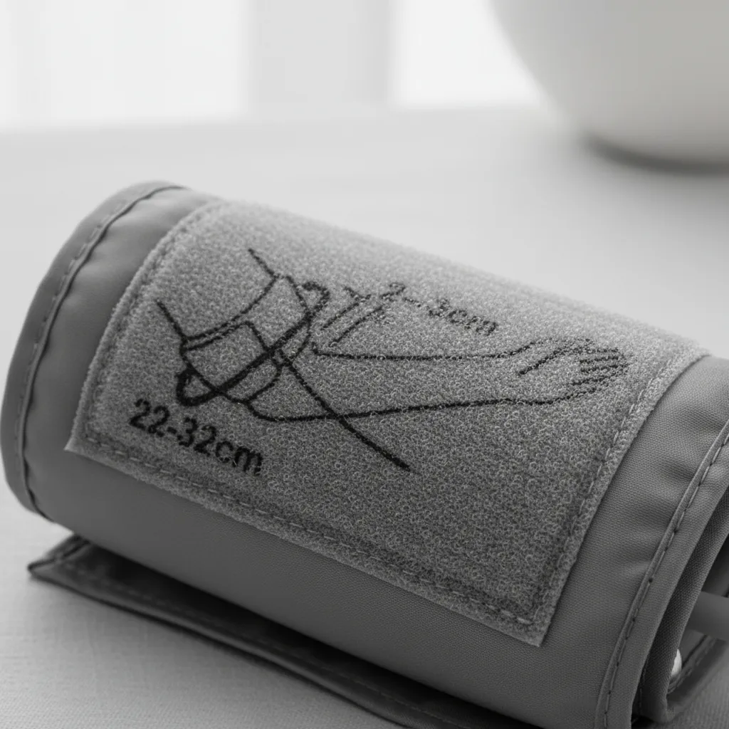 Colocar el brazalete en el brazo izquierdo, a unos 2–3 cm por encima del codo, ajustándolo sin apretar demasiado.
