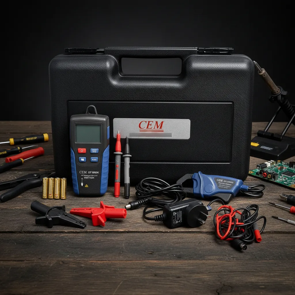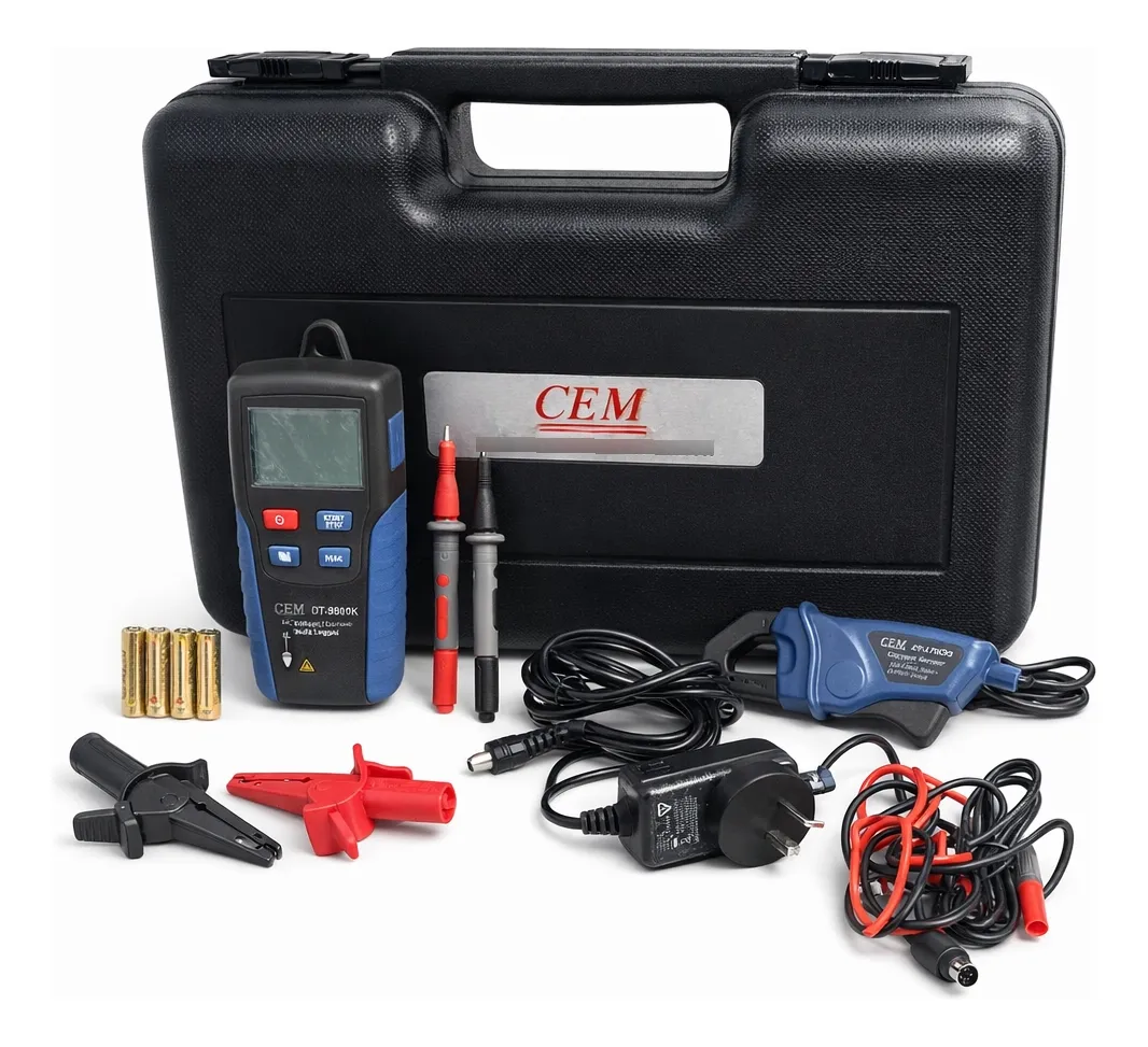El CEM DT-9800K es un registrador de datos portátil diseñado para la medición y el registro de parámetros eléctricos como tensión y corriente, ideal para tareas de diagnóstico, mantenimiento y análisis en instalaciones eléctricas y equipos industriales. Se presenta en un kit completo con pinza de corriente, puntas de prueba, accesorios y estuche rígido de transporte, lo que permite un uso práctico, seguro y profesional tanto en campo como en laboratorio.