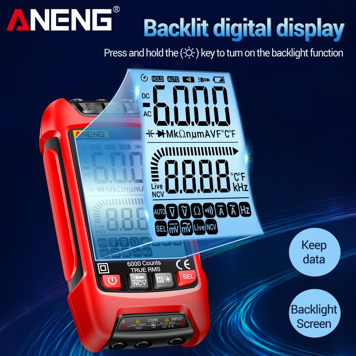 El ANENG SZ01 es un multímetro digital de alto rendimiento que ofrece mediciones de diodos, transistores, resistencias y voltajes. Su pantalla LCD retroiluminada facilita la visualización de resultados en diferentes condiciones de luz.