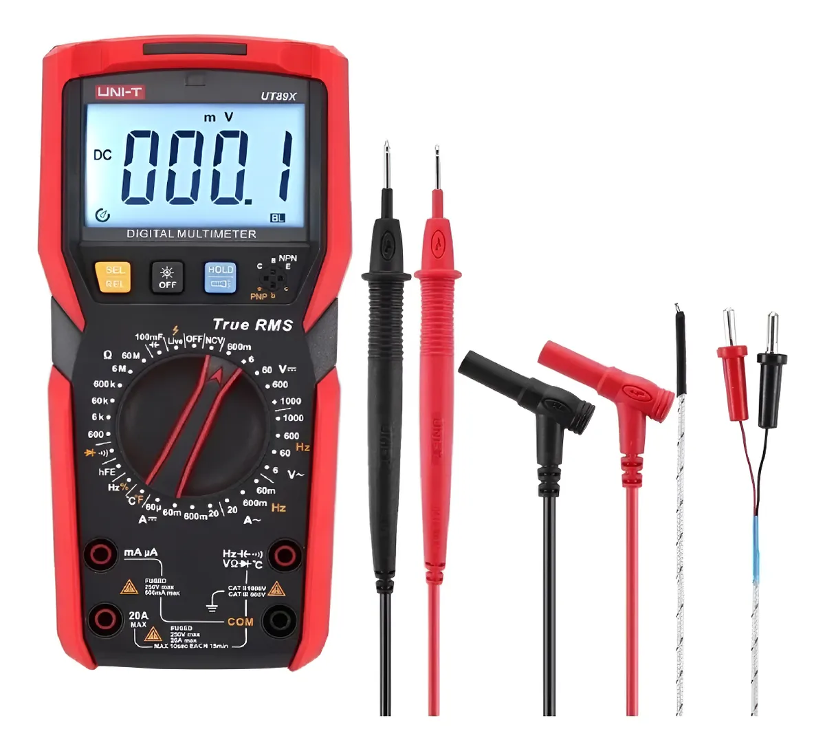 El UNI-T UT-89X es un multímetro digital portátil de alto rendimiento, ideal para profesionales y aficionados de la electricidad, electrónica y automotriz. Diseñado para ofrecer mediciones precisas y confiables, cuenta con una amplia gama de funciones avanzadas.