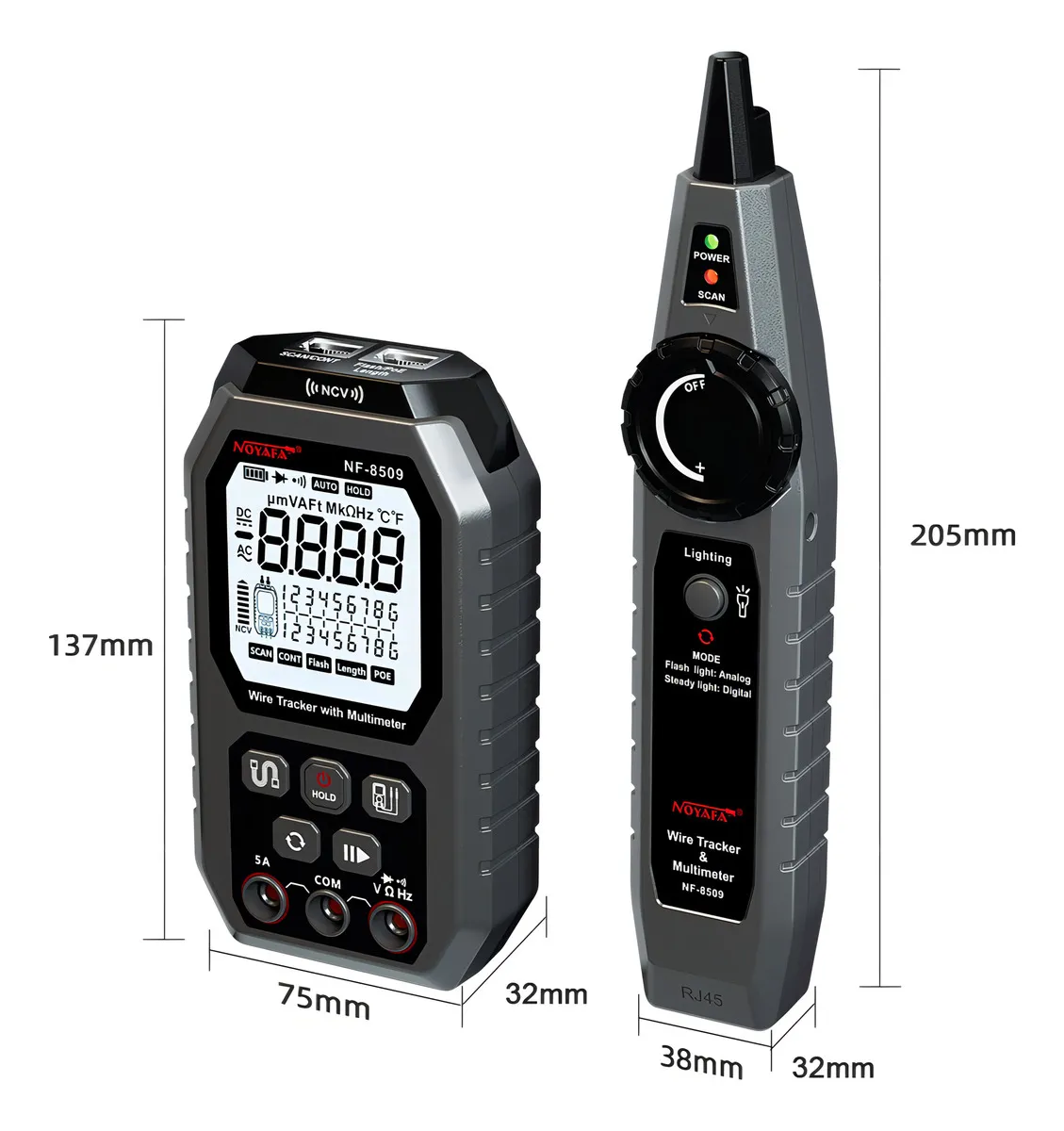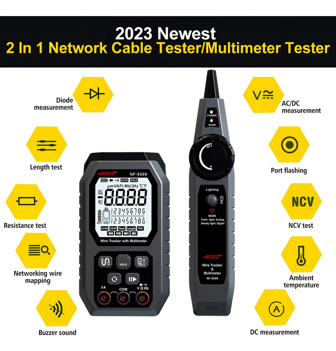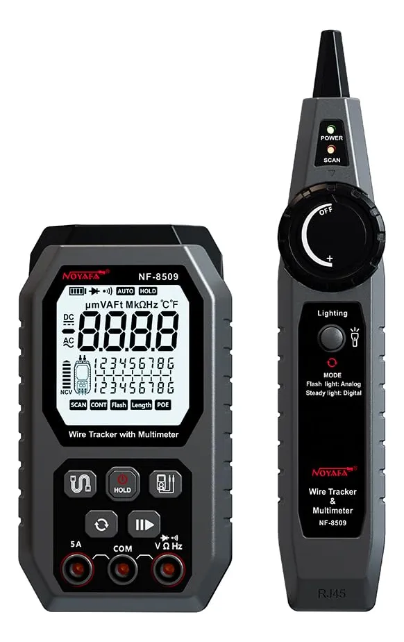 El Noyafa Probador de Cable de Red con Probador Multímetro Pro es una herramienta multifuncional diseñada para profesionales de redes, electricistas y técnicos de mantenimiento. Combina en un solo dispositivo las funciones de un probador de cables y un multímetro digital, lo que permite diagnosticar de manera eficiente y precisa cables de red, líneas telefónicas y conexiones eléctricas.