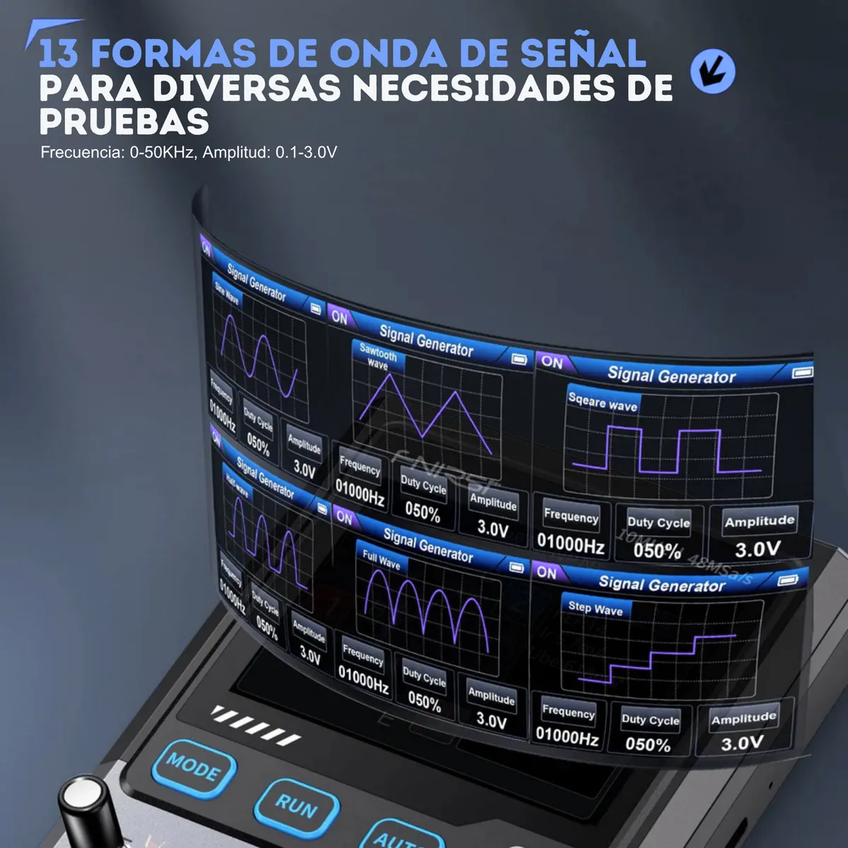 • 3-en-1 real: osciloscopio + probador de componentes + generador de funciones.