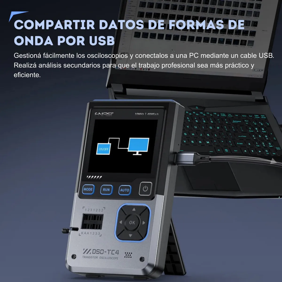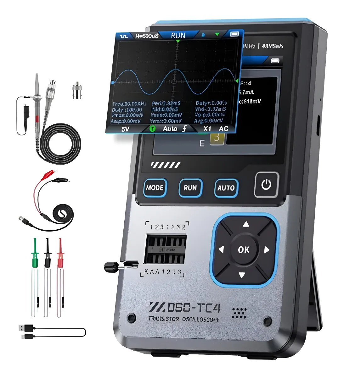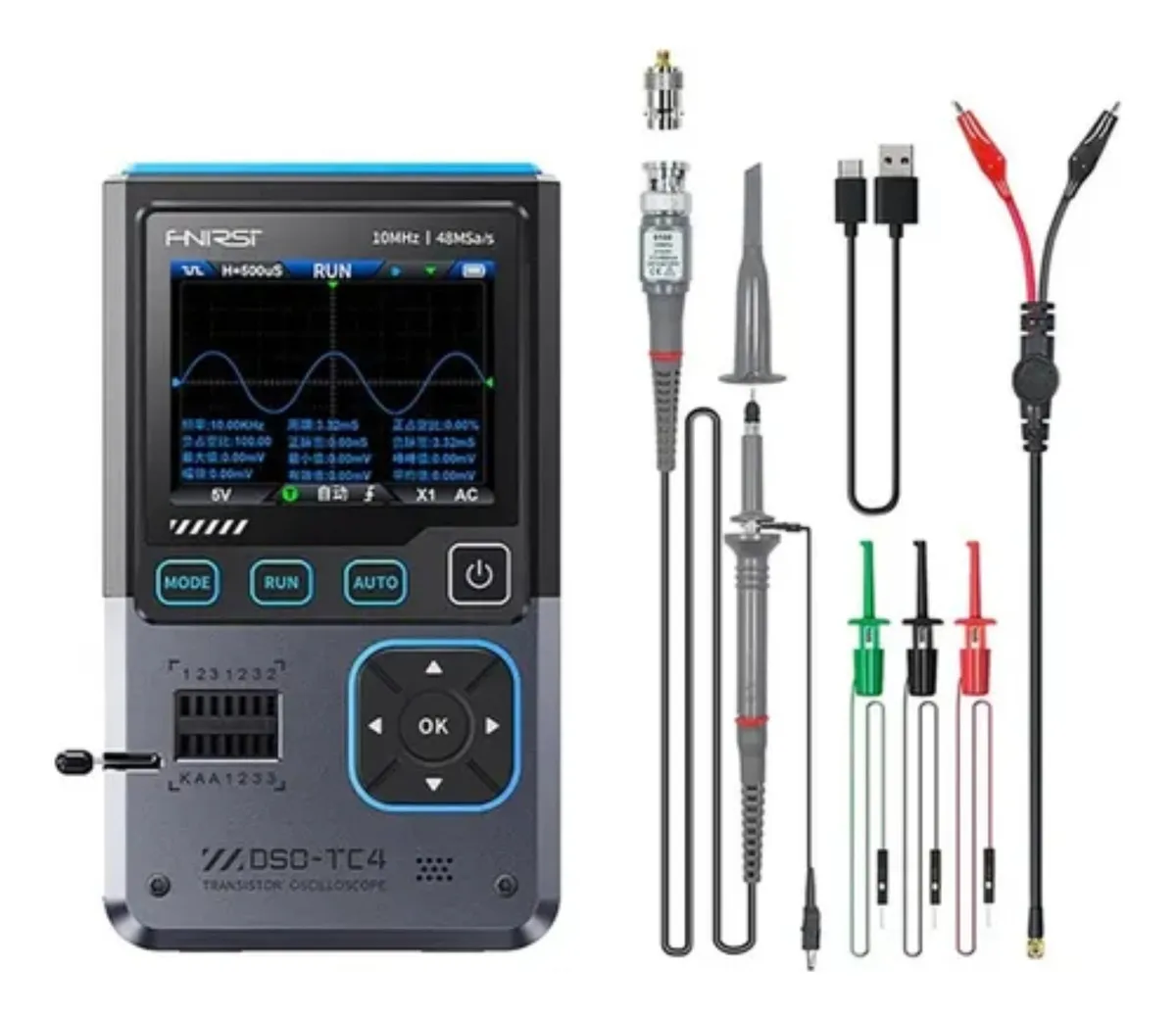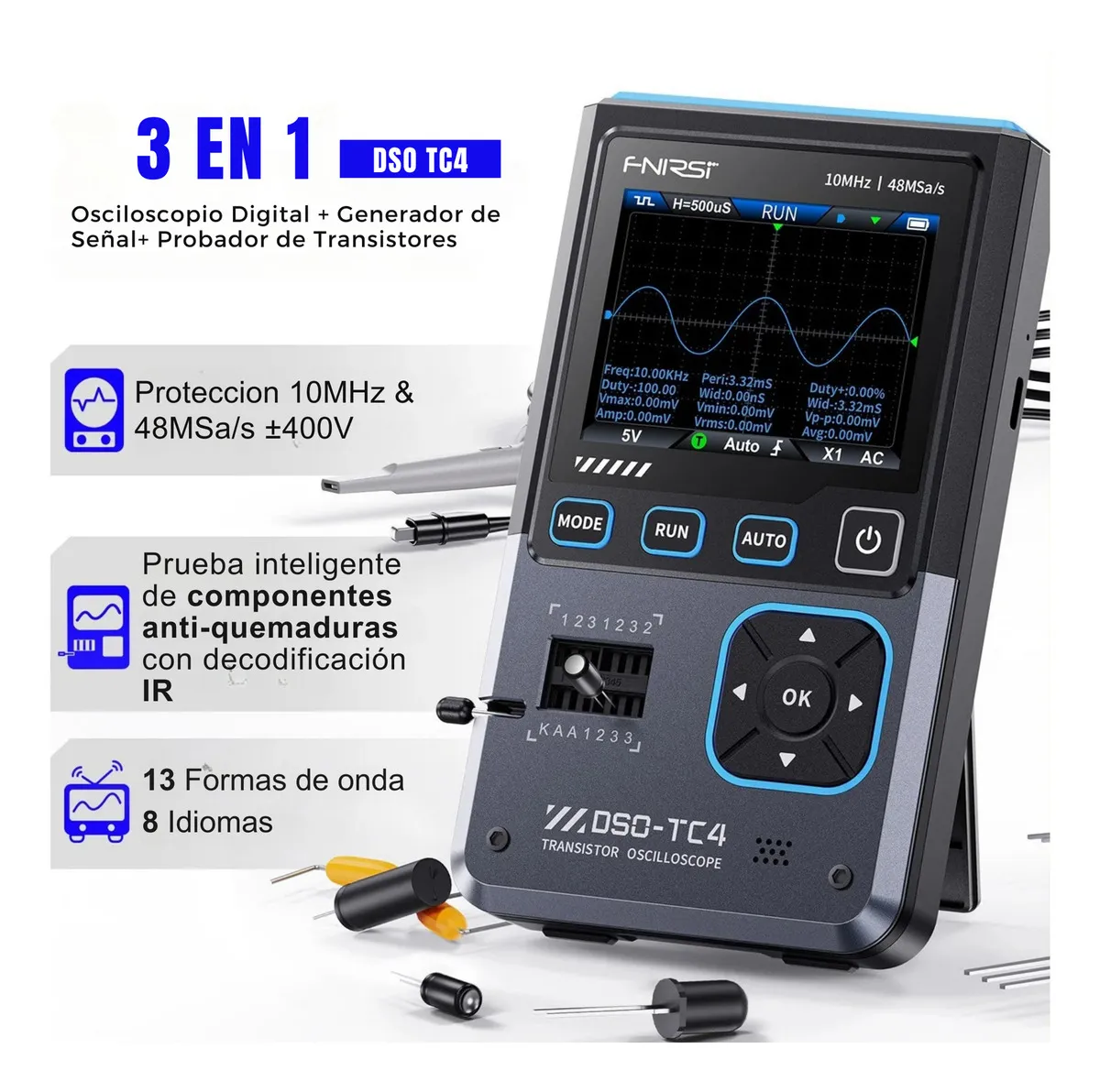 FNIRSI DSO-TC4 3-EN-1 – OSCILOSCOPIO 10 MHz • 48 MSa/s • PROBADOR DE TRANSISTORES • GENERADOR 0-50kHz