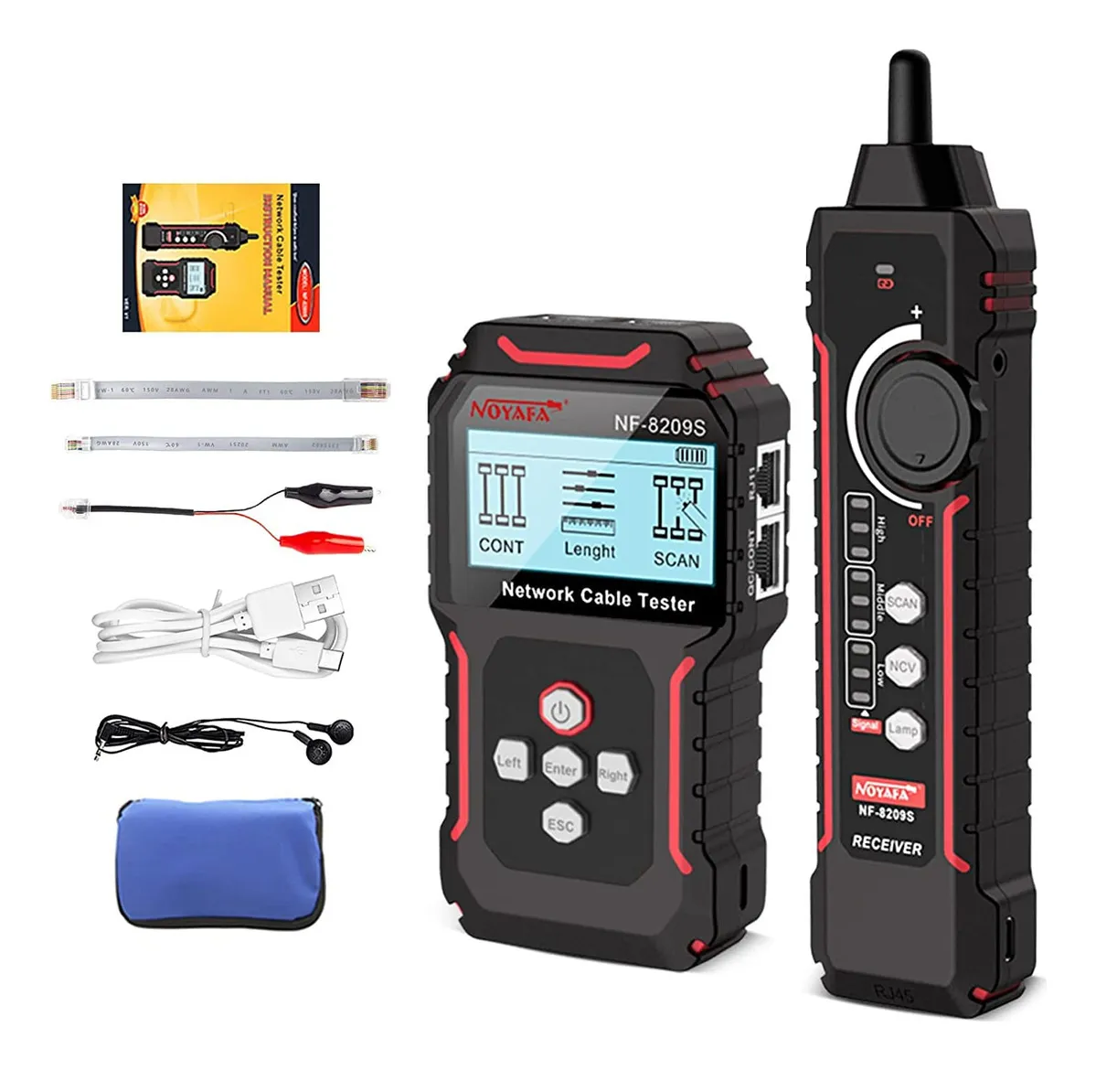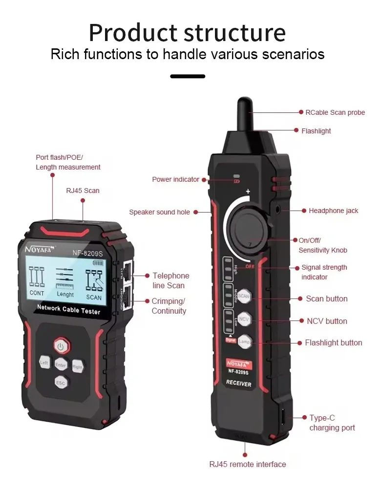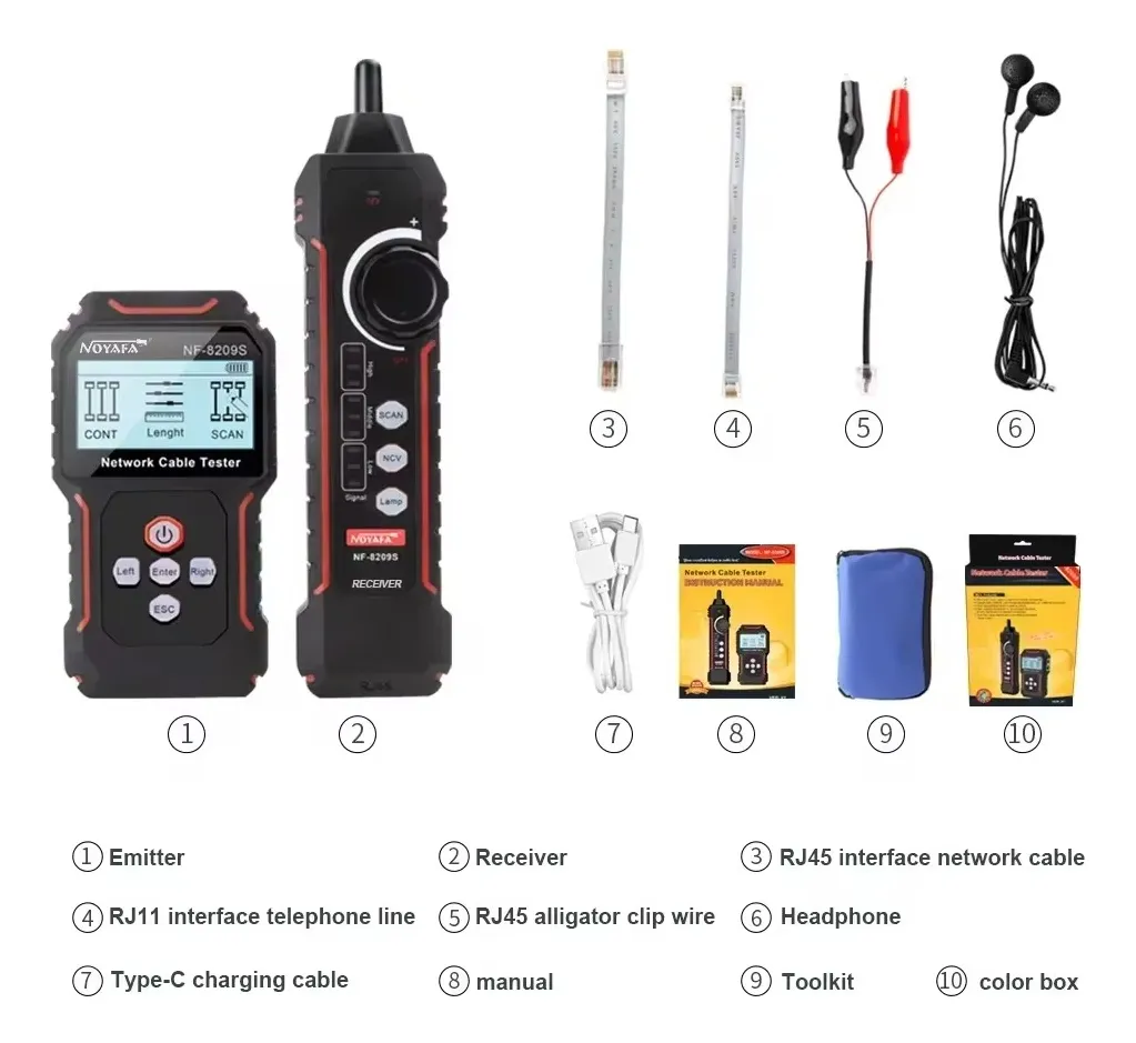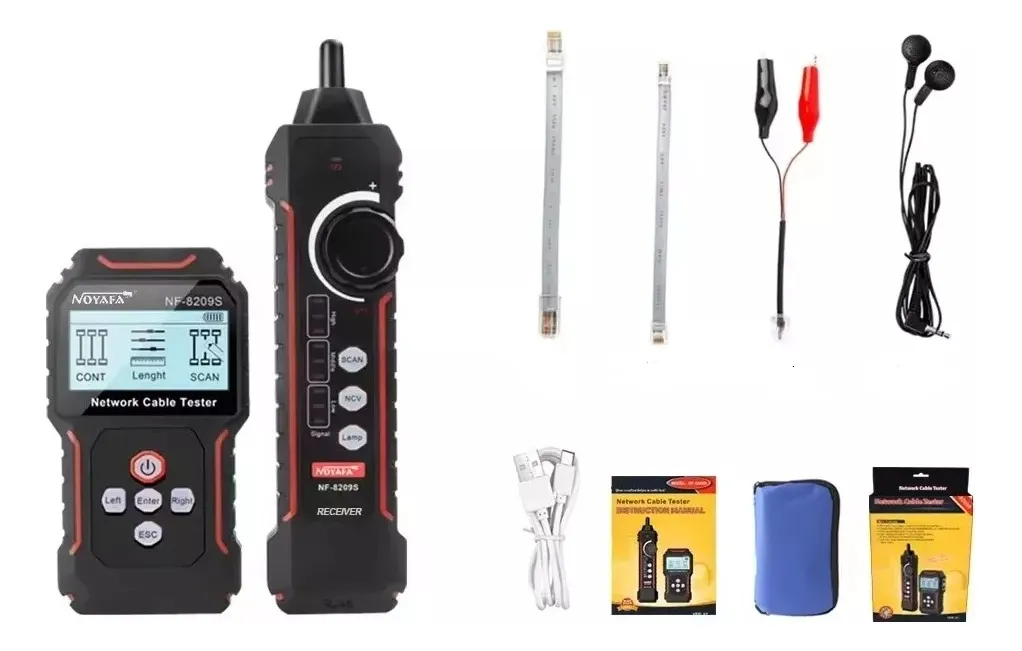 NF-8209S probador de cables de red actualizado, basado en productos NOYAFA NF-8209. Modo de escaneo de cable de red antiinterferencia, utilizando tecnología de recepción y decodificación de señal digital, el grado antiinterferencias es más alto y más preciso, eliminando el error de juicio. Funciones de escaneo de cable normal, escaneo de cable antiinterferencia, prueba CONT, prueba de longitud de cable, prueba de PoE, parpadeo de puerto, prueba de supresión de cable, pluma de inducción NCV, etc., que pueden satisfacer las necesidades de los usuarios en mayor medida y mejorar la eficiencia del trabajo.