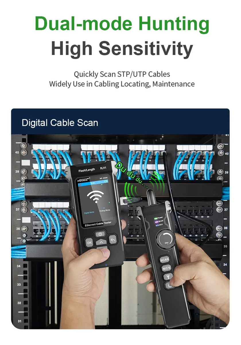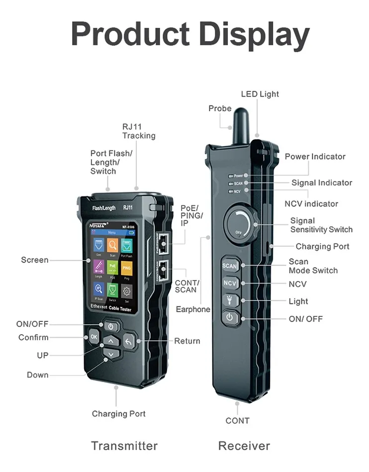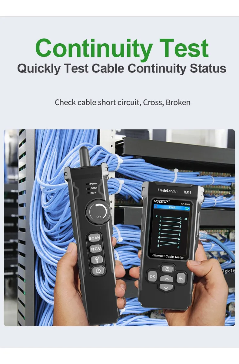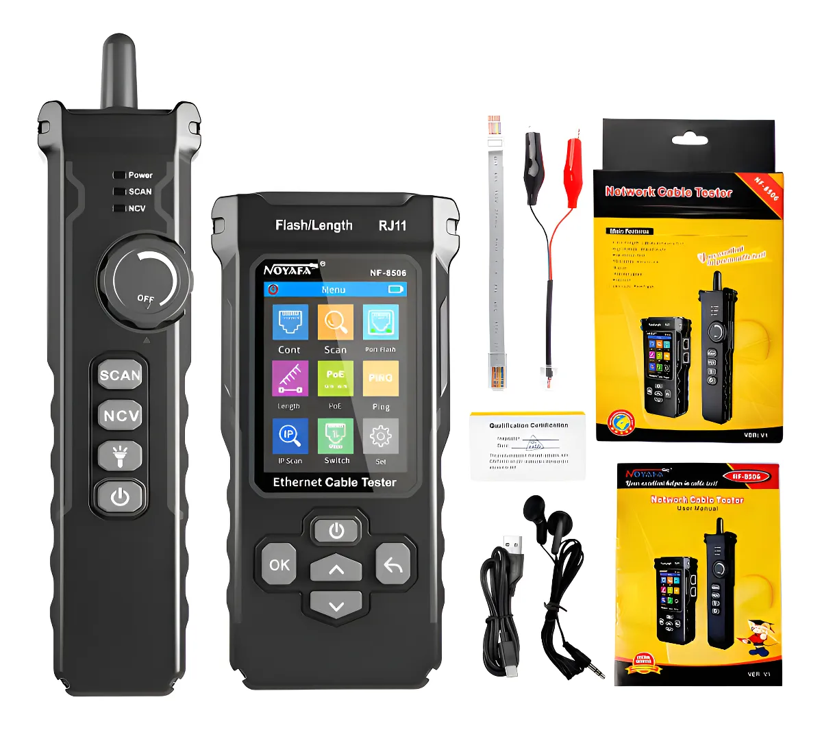 El tester de cables de red Noyafa NF-8506 es una herramienta profesional diseñada para técnicos en redes, instaladores y electricistas. Permite comprobar la continuidad y el mapa de cableado de redes RJ45, detectar alimentación PoE y medir la longitud de los cables de red con alta precisión. Su pantalla a color, funciones avanzadas y diseño portátil lo convierten en un dispositivo confiable para la instalación, mantenimiento y diagnóstico de sistemas de cableado estructurado.