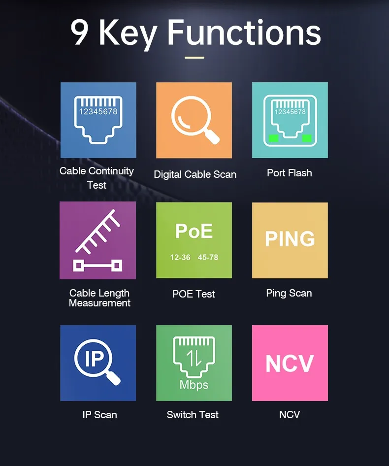 Funciones principales: prueba de continuidad, mapa de cableado, detección de PoE y medición de longitud