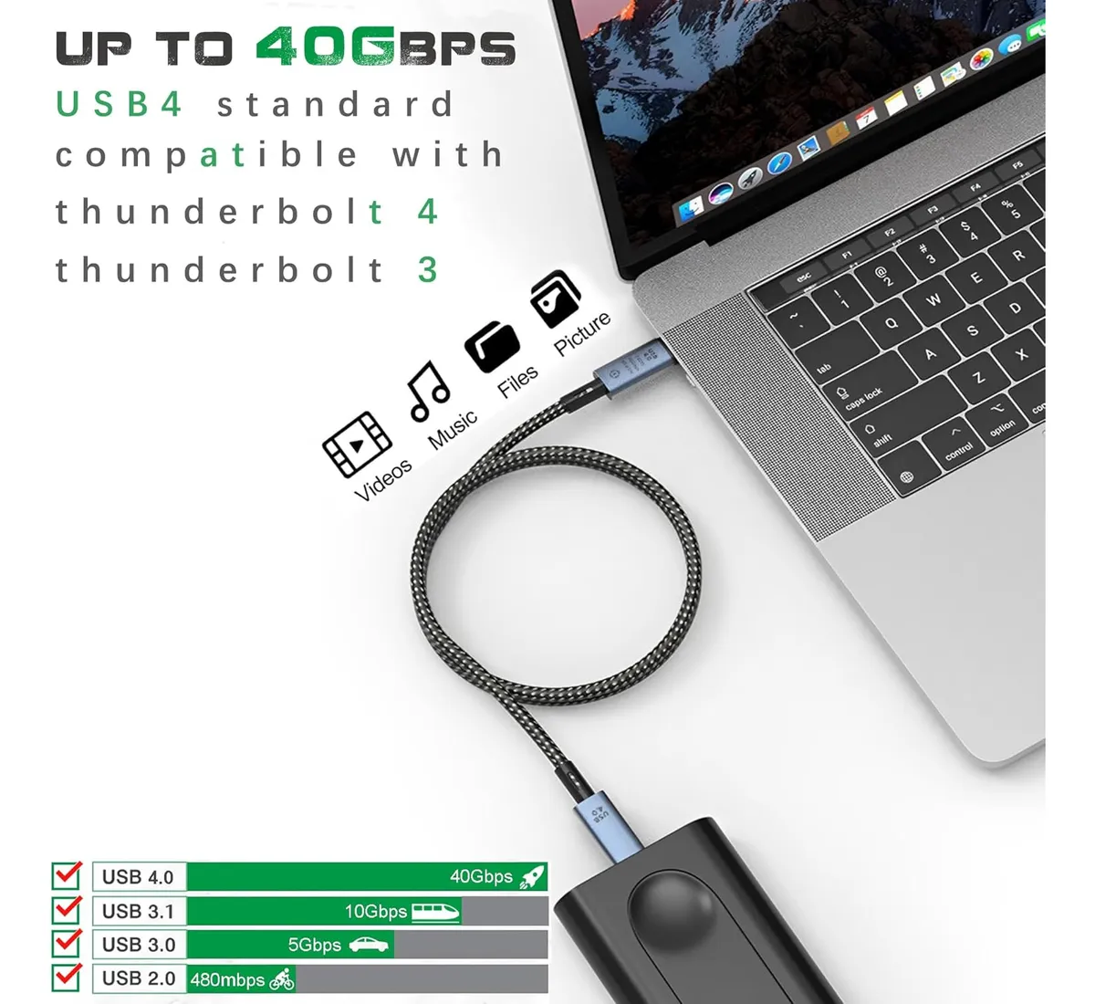 El cable USB-C Thunderbolt 3 / USB 4.0 de 1 metro está diseñado para ofrecer el máximo rendimiento en transferencia de datos, carga rápida y transmisión de video de alta resolución.