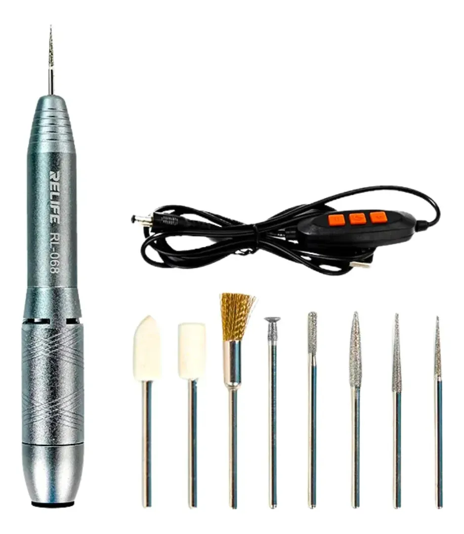 El Sunshine Relife RL-068 es una herramienta portátil y versátil diseñada para pulir, grabar, esmerilar, cortar y limpiar placas de circuitos, chips, carcasas plásticas y componentes electrónicos delicados. Funciona con conexión USB o power bank, ofreciendo control de velocidad ajustable y una sujeción segura para trabajos de precisión.