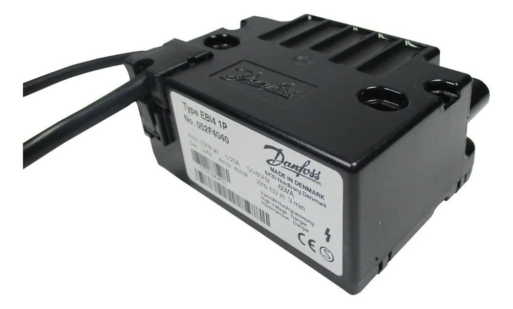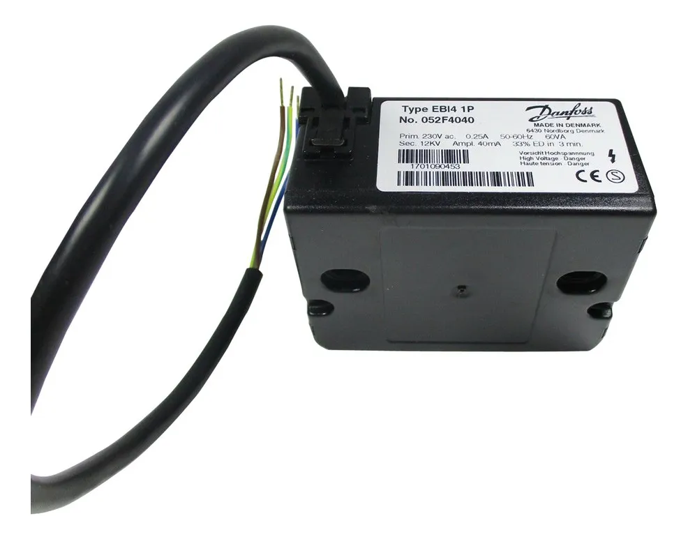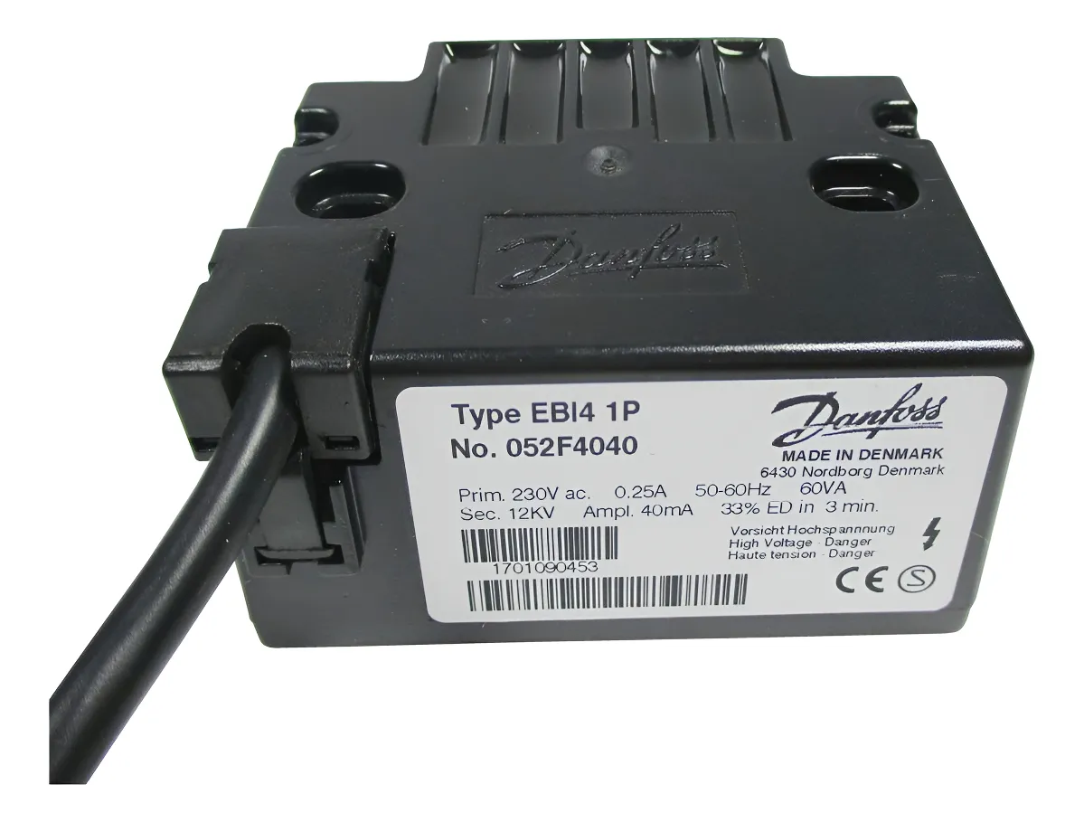 El transformador de encendido Danfoss EBI4 1P modelo 052F4040 es un componente de alta confiabilidad diseñado para quemadores de gasoil y sistemas de calefacción. Proporciona una chispa estable y potente para el encendido seguro del quemador, ofreciendo un rendimiento constante incluso en condiciones exigentes. Es una solución ideal para mantenimiento, reparación o reemplazo en equipos que utilizan encendido electrónico de alta tensión.