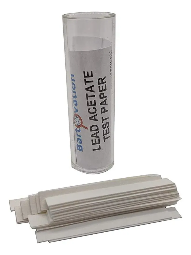 Ficha técnica Tipo de producto: Papel reactivo para detección de sulfuro de hidrógeno Reactivo: Acetato de plomo Parámetro detectado: Sulfuro de hidrógeno Método de detección: Colorimétrico Formato: Tiras de papel reactivo Cantidad: 100 tiras Tipo de muestra: Aire y gases Tiempo de respuesta: Inmediato Material: Papel impregnado con acetato de plomo Presentación: Frasco plástico protector