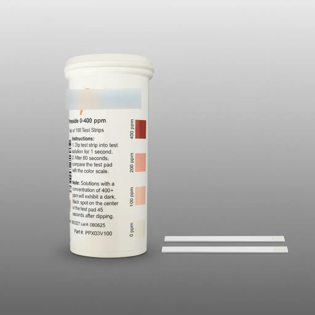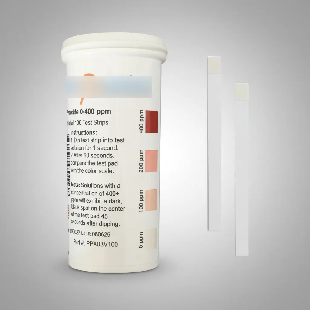 Uso: Manual, no requiere equipos electrónicos Condiciones de almacenamiento: Lugar seco, fresco y protegido de la luz Especificaciones Medición específica de peróxido de hidrógeno en concentraciones bajas a medias Lectura directa mediante escala cromática incluida en el envase No utiliza reactivos líquidos ni instrumentos de medición Uso simple, rápido y portátil Adecuadas para controles rutinarios y monitoreo de procesos Tiras descartables de un solo uso Resultados orientativos para control y verificación operativa