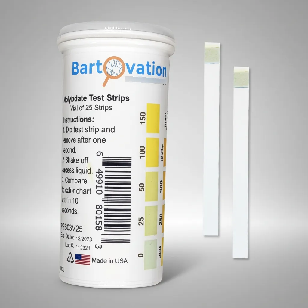 La tira de prueba de molibdato 0–350+ ppm permite medir de forma rápida y sencilla la concentración de molibdato en agua y soluciones acuosas. Es ideal para controles en sistemas de tratamiento de agua, calderas, torres de enfriamiento, procesos industriales, laboratorios y aplicaciones educativas. Brinda resultados inmediatos mediante comparación visual, sin necesidad de instrumental ni reactivos adicionales.