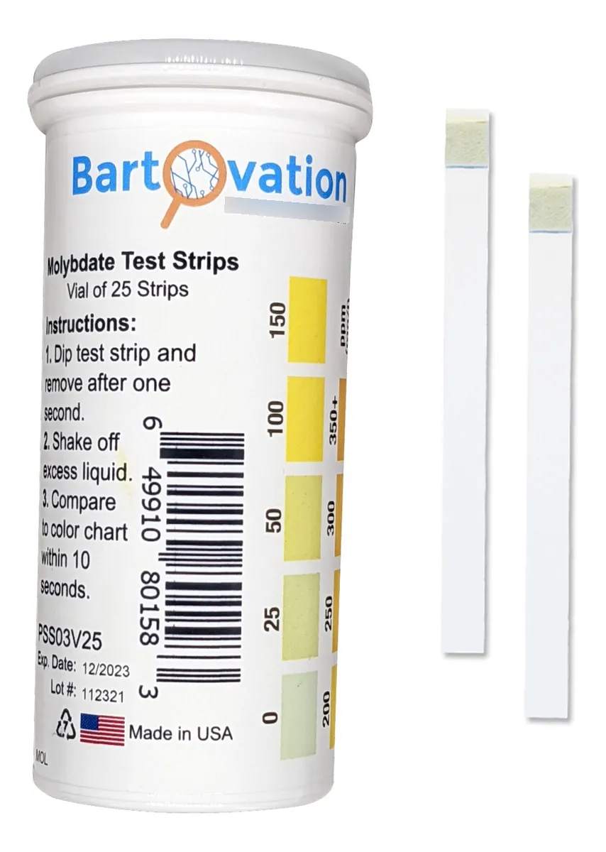 Tipo de producto: Tiras reactivas para medición de molibdato Parámetro medido: Molibdato Rango de medición: 0 a 350+ ppm Método de medición: Colorimétrico Formato: Tiras reactivas individuales Cantidad: 25 tiras Tipo de muestra: Agua y soluciones acuosas Tiempo de respuesta: Segundos Material del soporte: Plástico y papel reactivo Presentación: Vial plástico protector