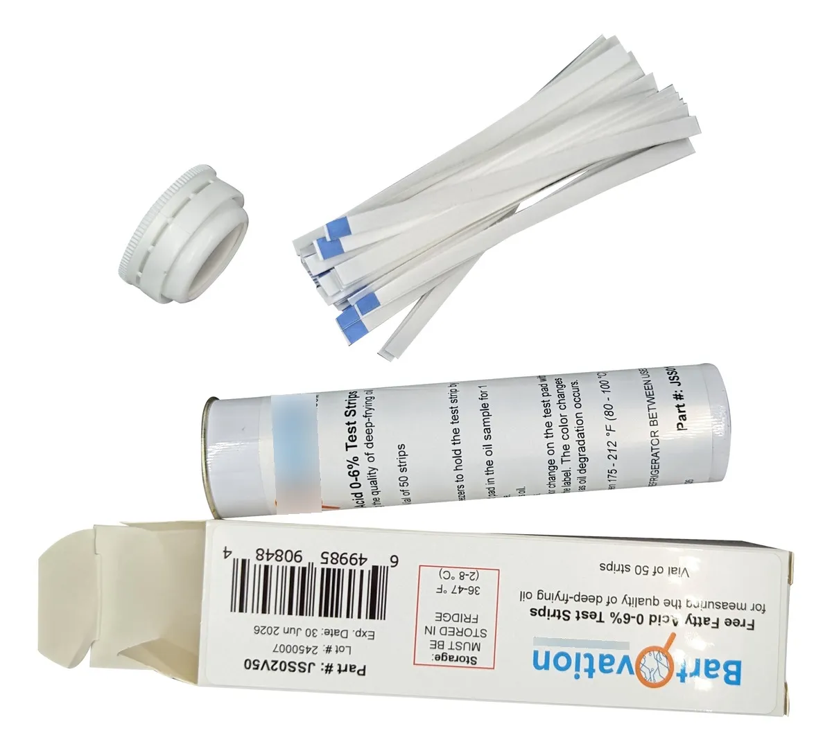 Las tiras de prueba de ácidos grasos libres (FFA) permiten evaluar de manera rápida y sencilla la calidad del aceite utilizado para freír. Están diseñadas para medir el porcentaje de ácidos grasos libres, un indicador clave del deterioro del aceite por uso y temperatura. Son ideales para cocinas profesionales, restaurantes, industrias alimentarias y controles básicos de calidad, sin necesidad de equipos electrónicos ni reactivos adicionales.