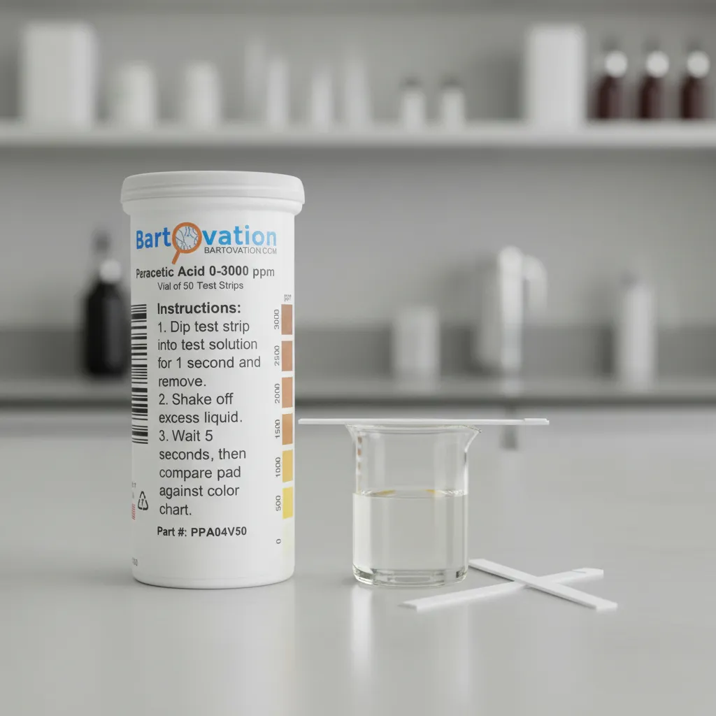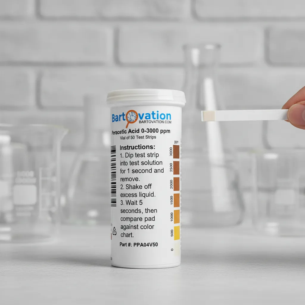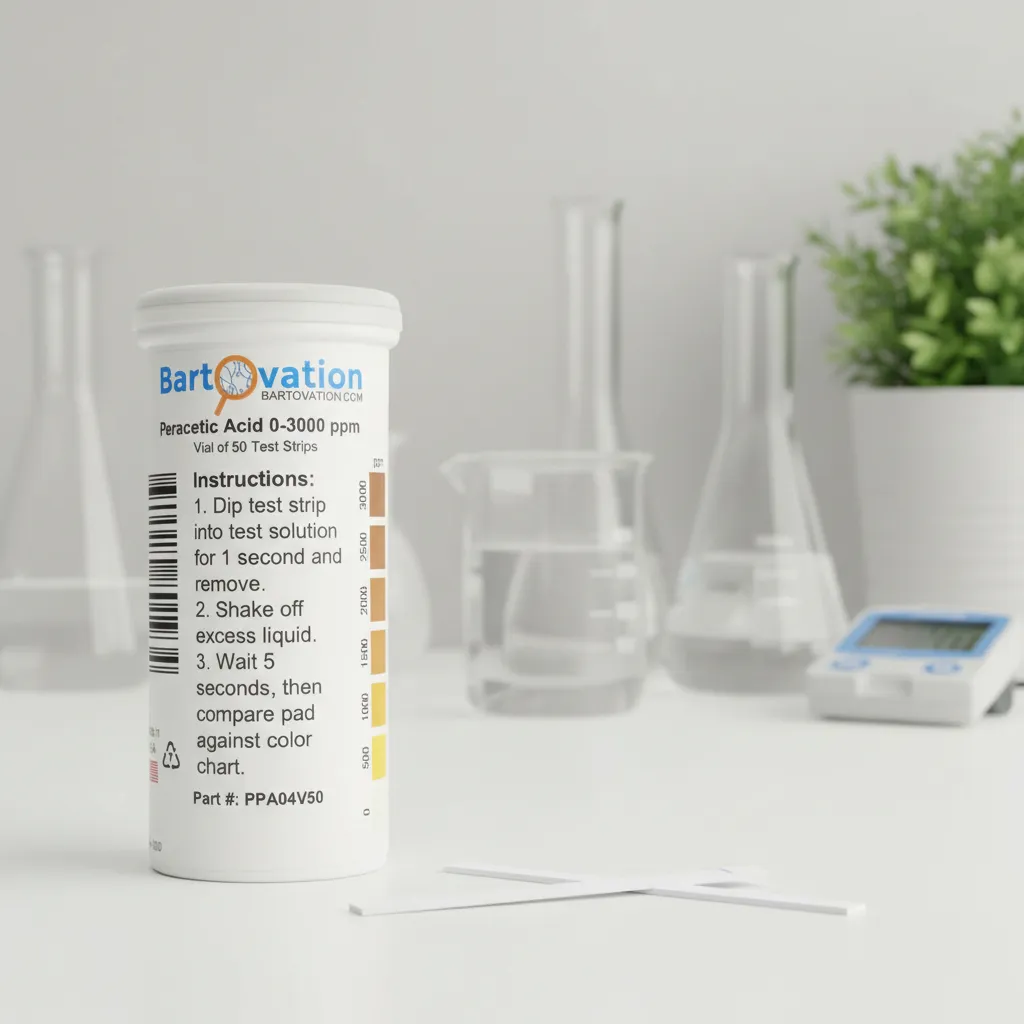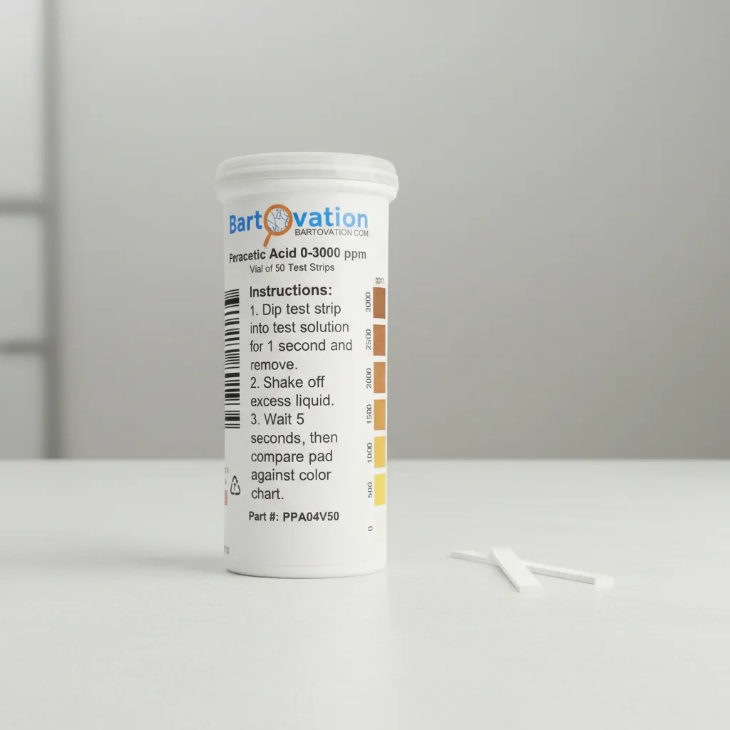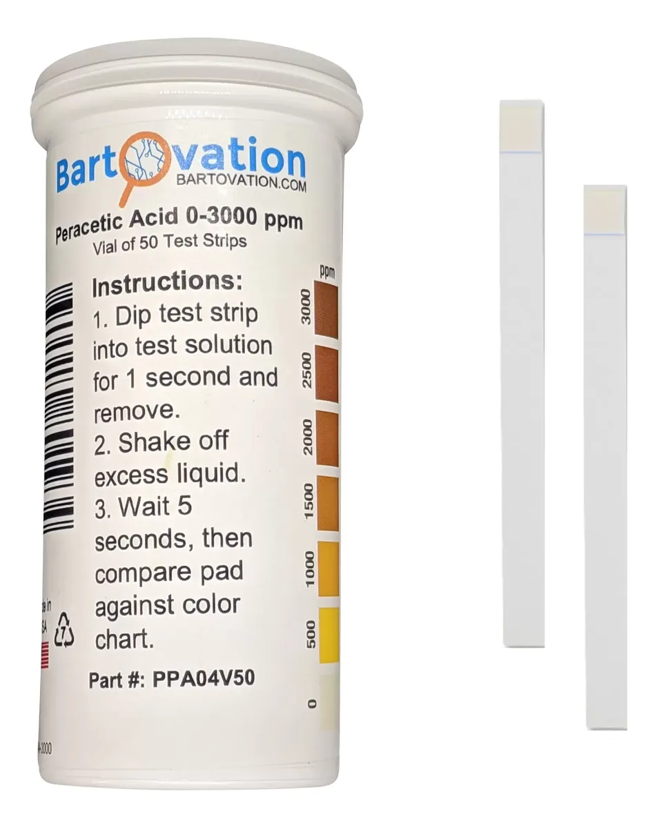 Ficha técnica Tipo de producto: Tiras reactivas para ácido peracético Método de medición: Colorimétrico por comparación visual Rango de medición: 0 a 3000 ppm Nivel de detección: Extra alto Resolución aproximada: Escalonada según escala de color Tiempo de reacción: 10 a 30 segundos Cantidad de tiras: 50 unidades Material de la tira: Papel reactivo tratado Material del envase: Frasco plástico con tapa a rosca Dimensiones del frasco: Aproximadamente 9 × 3 cm