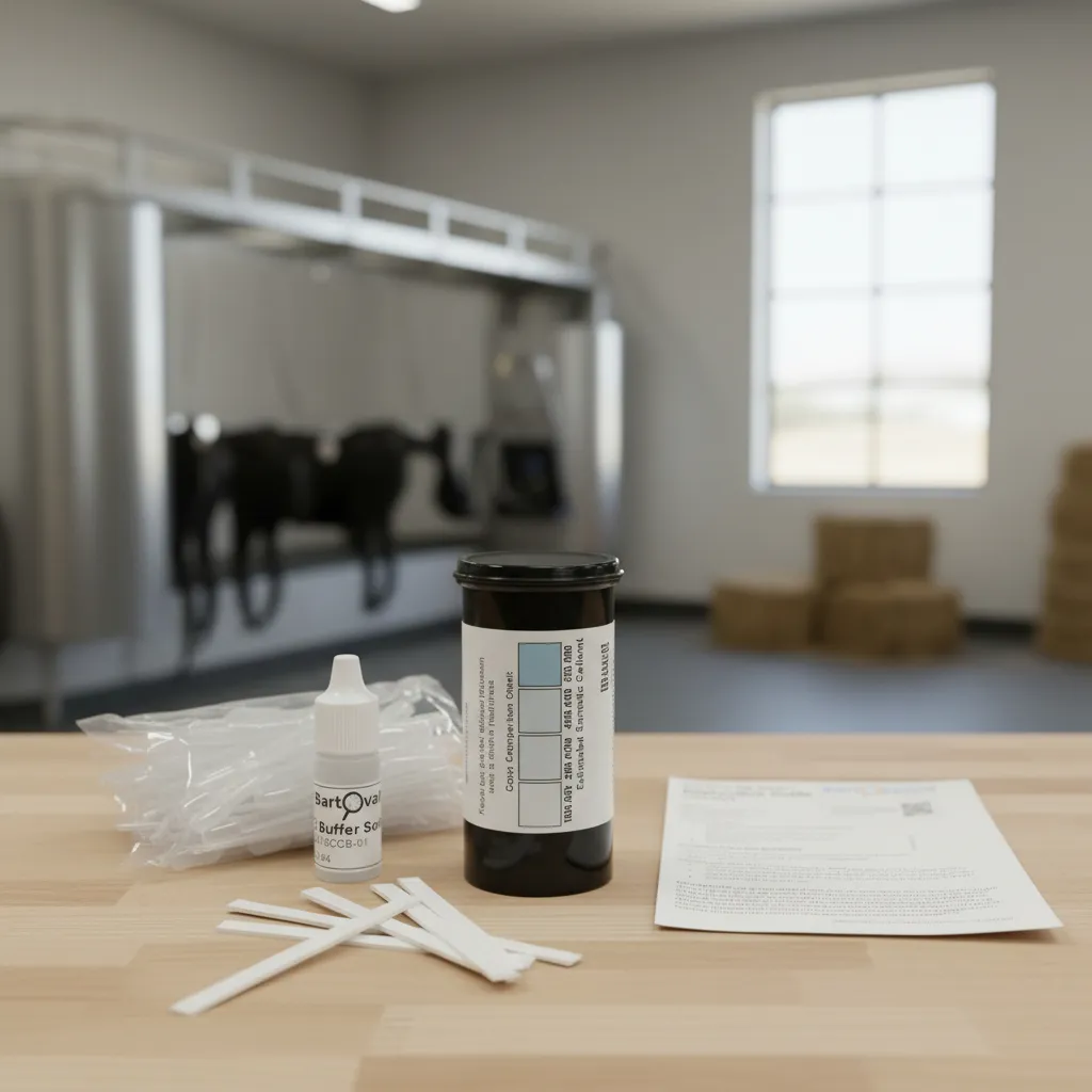 Kit de prueba de SCC en leche de vaca diseñado para la detección rápida y orientativa de mastitis subclínica. Mediante tiras reactivas de lectura visual, permite estimar el nivel de células somáticas en leche fresca de forma sencilla y directa, facilitando el control sanitario del rodeo y la toma de decisiones tempranas en tambos y establecimientos lecheros. Ideal para uso en campo y controles rutinarios sin necesidad de equipamiento adicional.