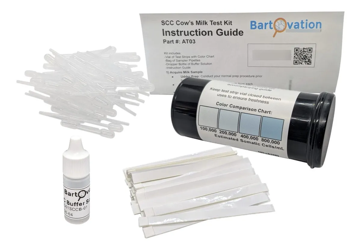 Kit de prueba rápida de SCC en leche bovina Método de medición: Reacción colorimétrica indicativa de células somáticas Muestra requerida: Leche fresca de vaca Presentación: Frasco con 50 tiras reactivas Tiempo de respuesta: 1 a 2 minutos Rango de detección: Indicativo de niveles bajos, medios y altos de SCC según escala del fabricante Precisión: Prueba orientativa para screening, no cuantitativa Uso previsto: Diagnóstico preliminar de mastitis subclínica Almacenamiento: Lugar fresco y seco, protegido de la luz directa