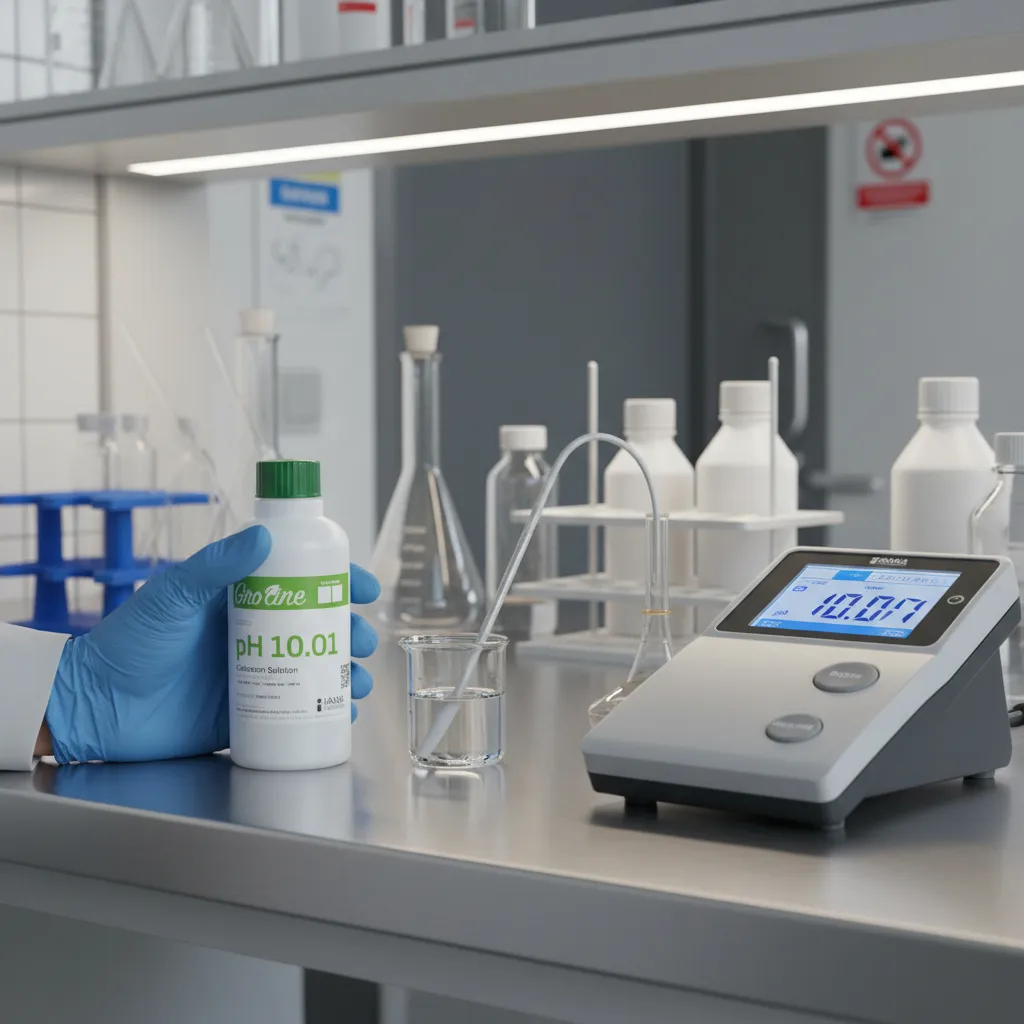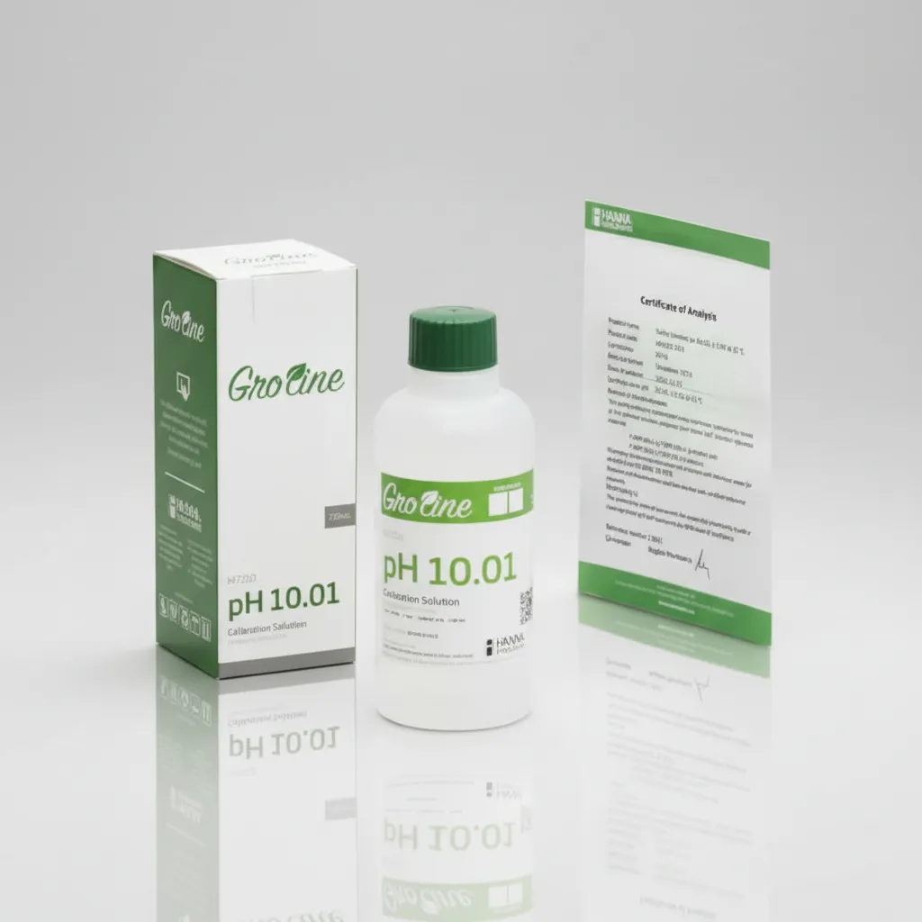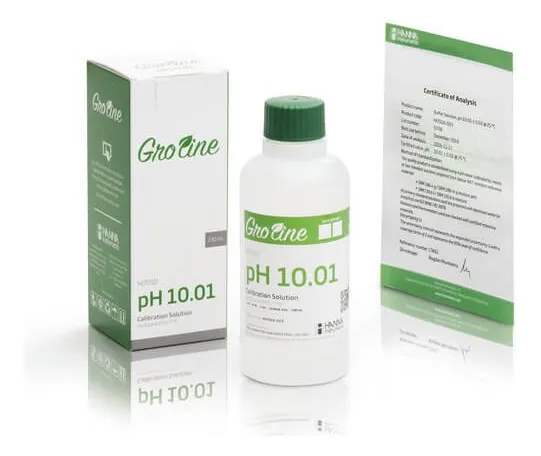 La solución buffer de calibración Hanna Instruments GroLine pH 10.01 modelo HI7010-023 está formulada para garantizar calibraciones precisas y estables de medidores de pH. Es ideal para aplicaciones agrícolas, hidropónicas, ambientales y de laboratorio, especialmente en rangos alcalinos, asegurando mediciones confiables y repetibles.