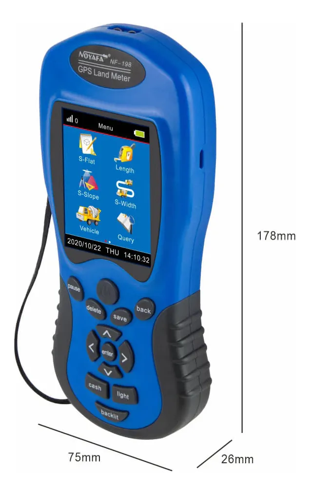 El medidor de terreno GPS Noyafa NF-198 es un instrumento portátil diseñado para realizar mediciones precisas de áreas, perímetros, longitudes y distancias en terrenos agrícolas, obras civiles, forestales o topográficos. Gracias a su pantalla LCD a color y su interfaz intuitiva, permite al usuario visualizar y registrar datos en tiempo real. Es ideal para profesionales que requieren obtener mediciones rápidas y confiables sin necesidad de equipos complejos de topografía.